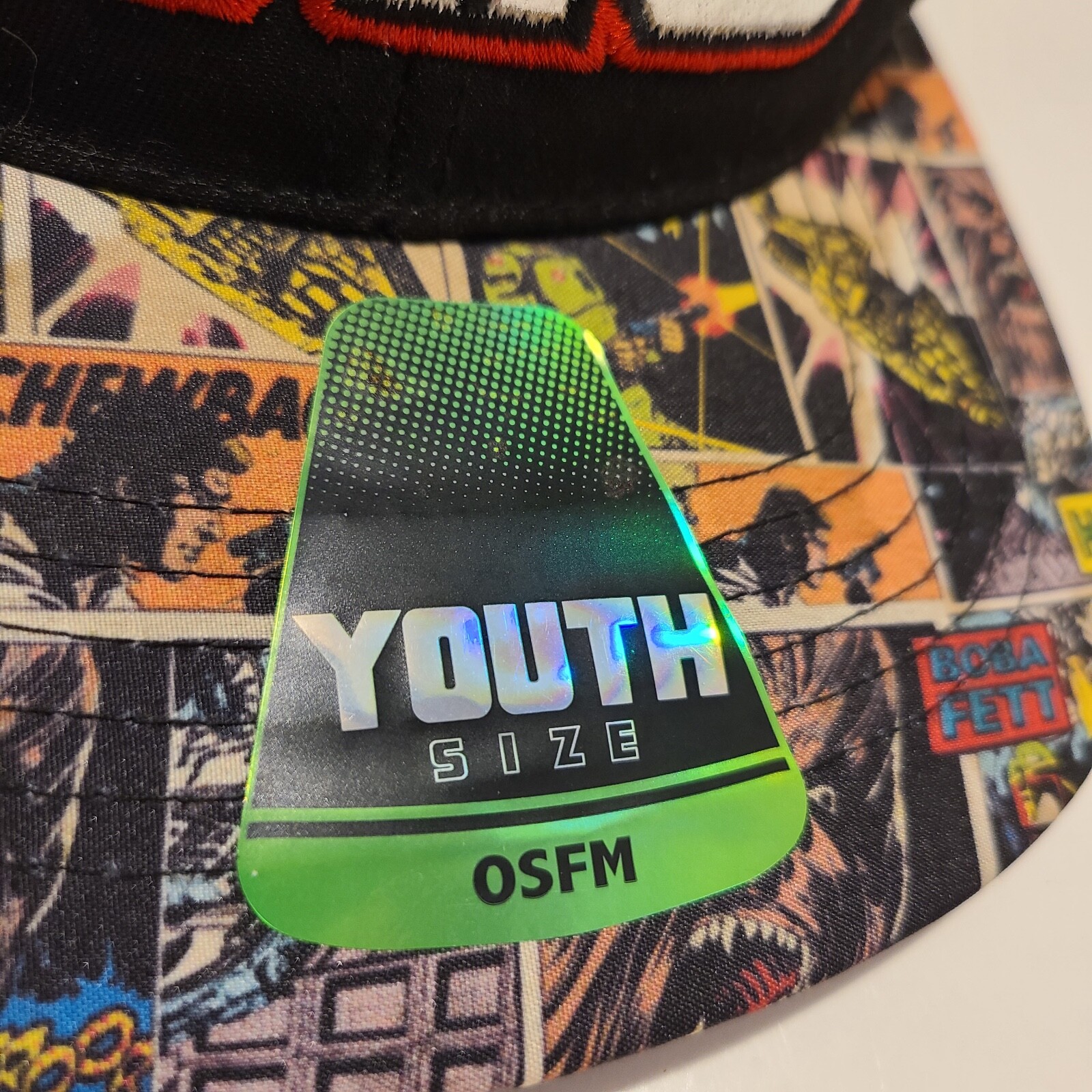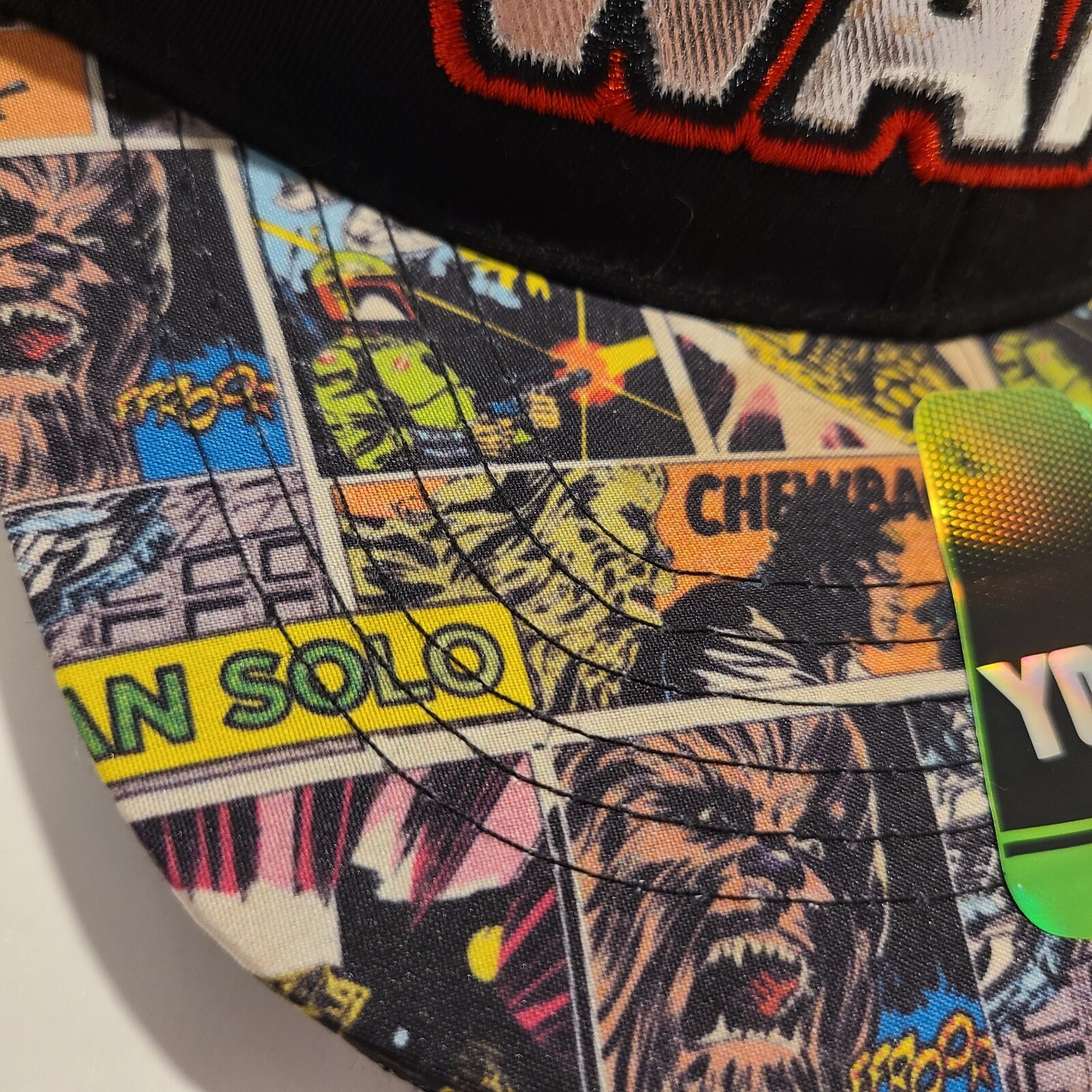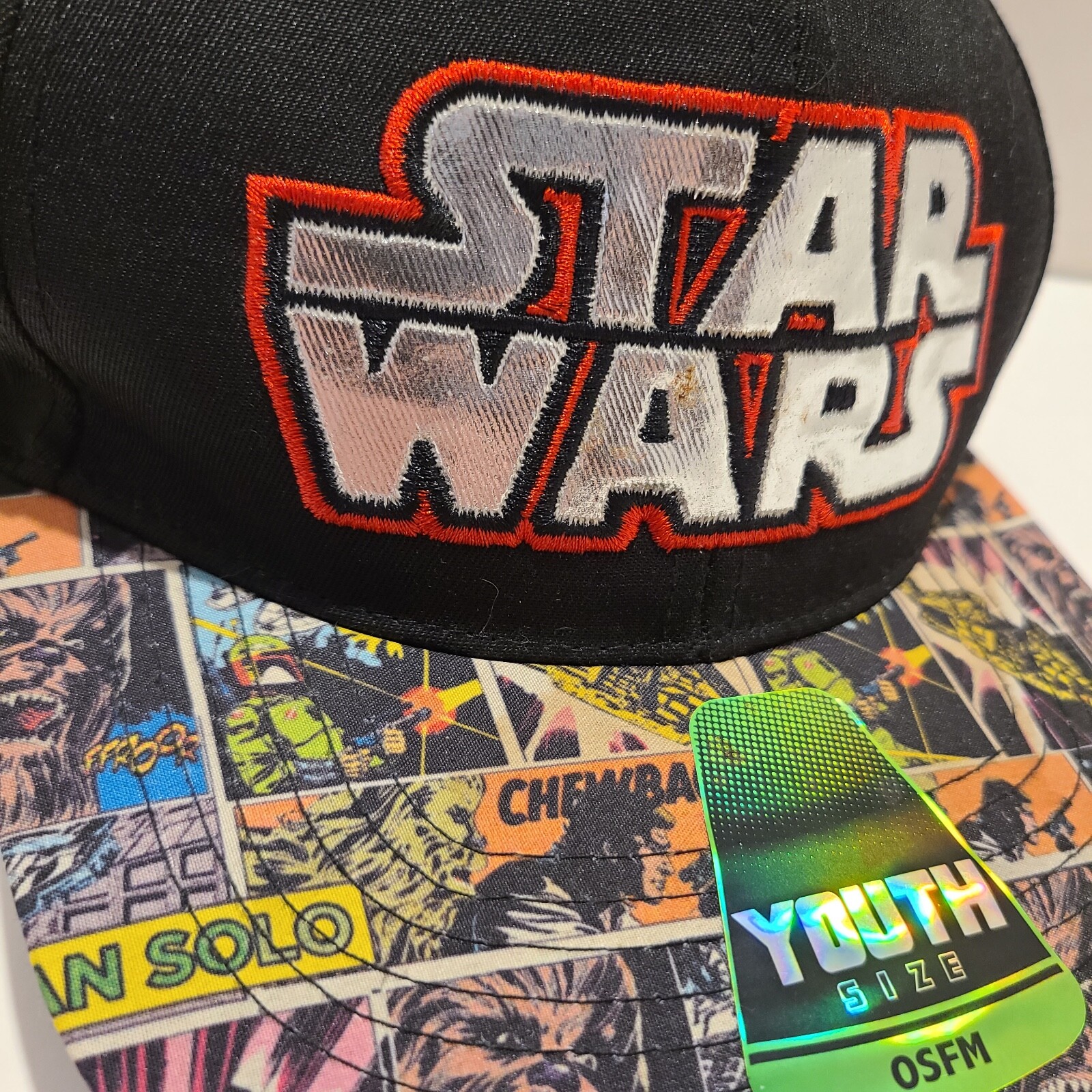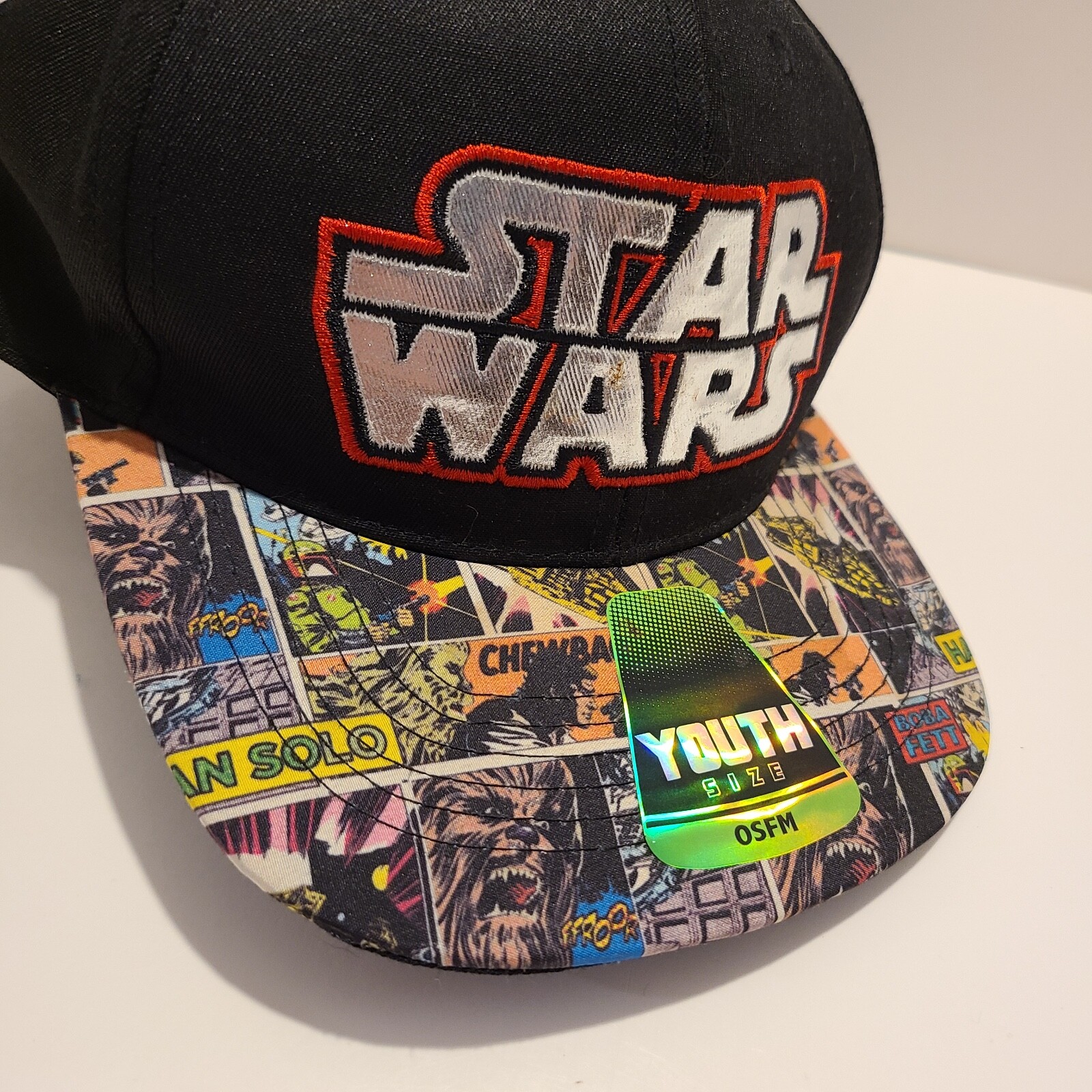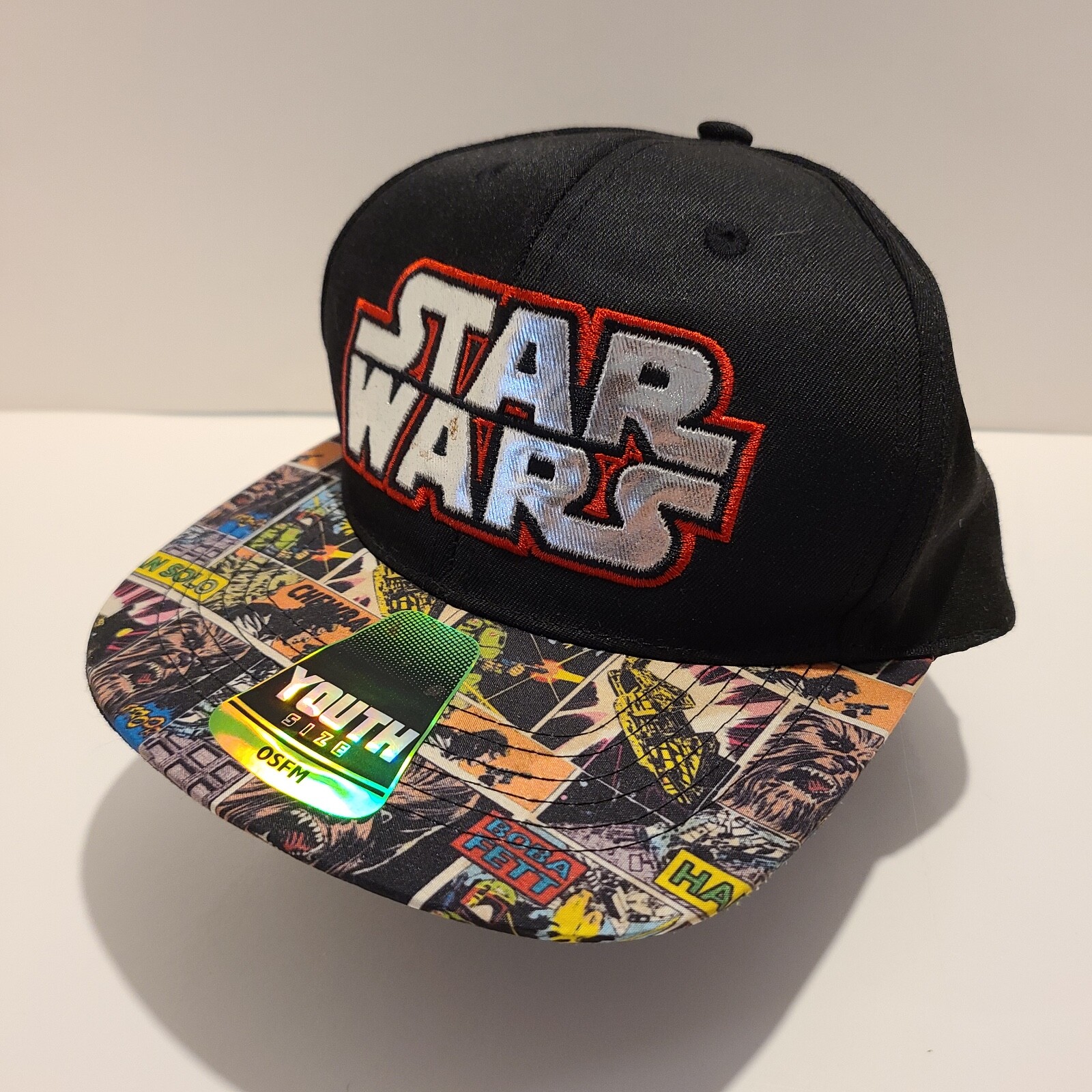 Star Wars Youth Size Baseball Style Hat with Printed Bill and Foil Embroidery.