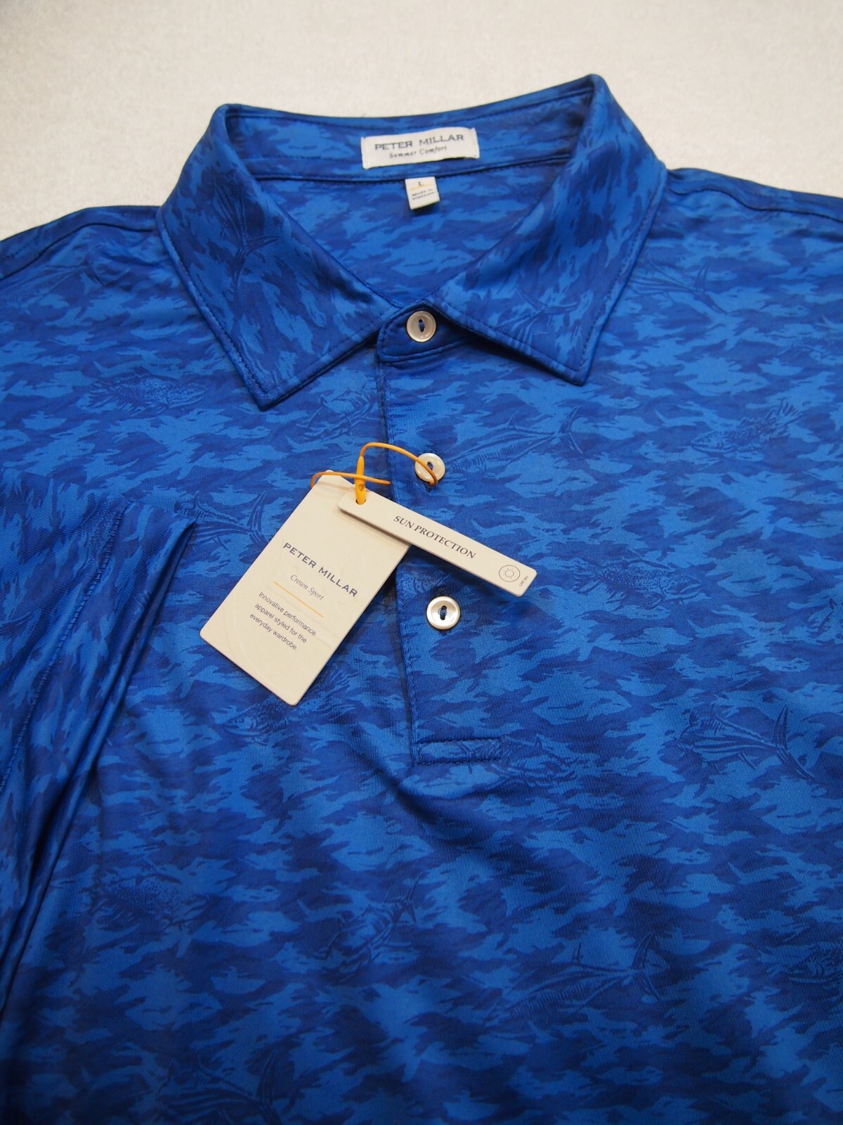 Peter Millar Crown Sport Performance Fish Camouflage Polo Shirt NWT XL 110 Blue