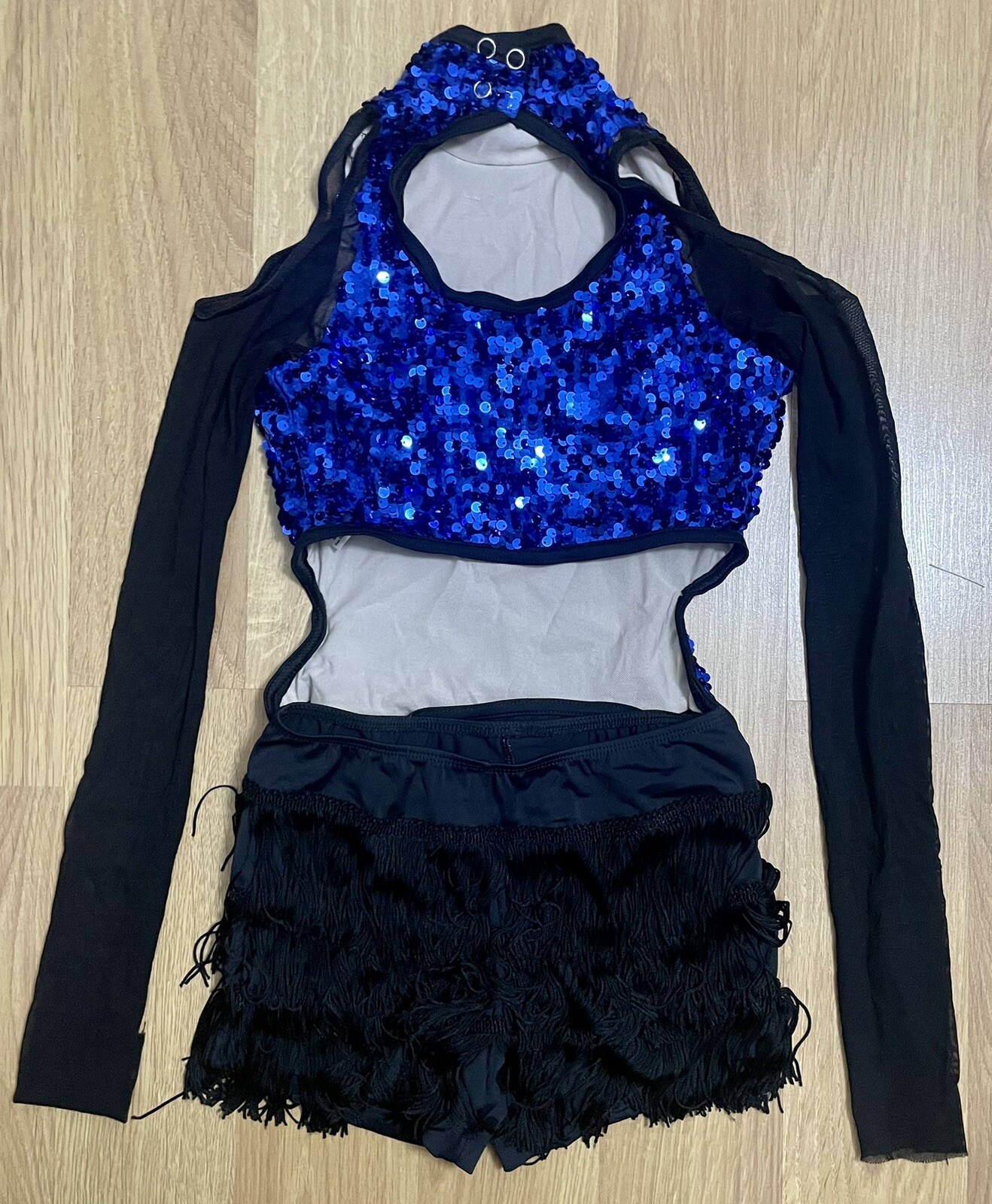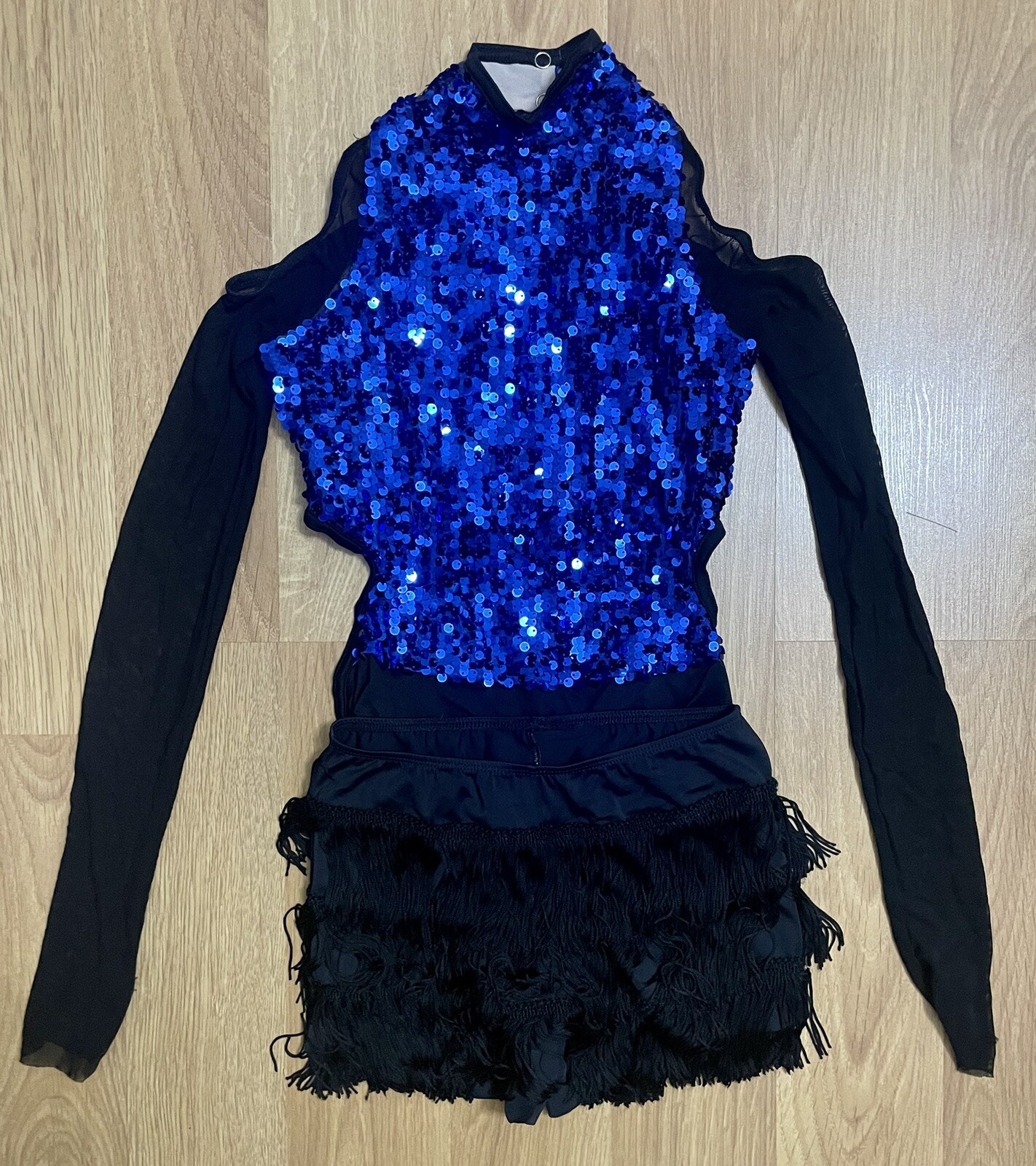 Blue Sequin Black Mesh/Fringe Flapper Weissman Dance/Halloween Med/MC/10-12