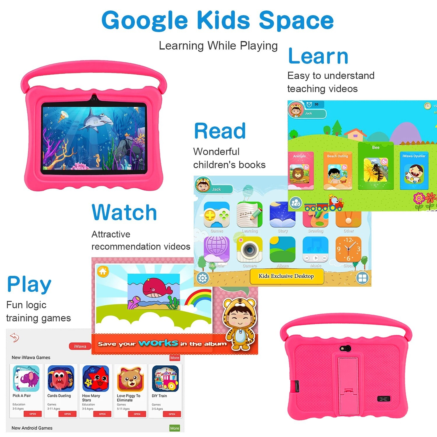 7 in Kids Tablet PC Android 9 Quad-Core Dual Cameras WiFi Bundle Case 64GB Pink