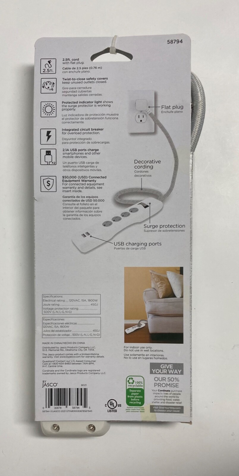 58794 CORDINATE USB CHARGING SURGE PROTECTOR 2.5FT BRAIDED CORD WITH FLAT PLUG