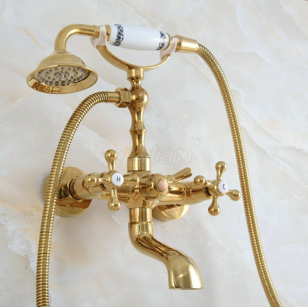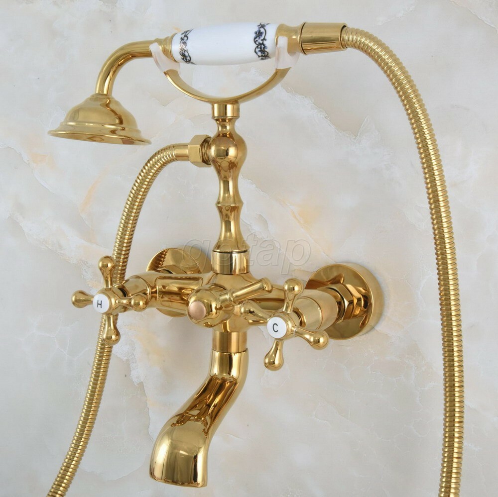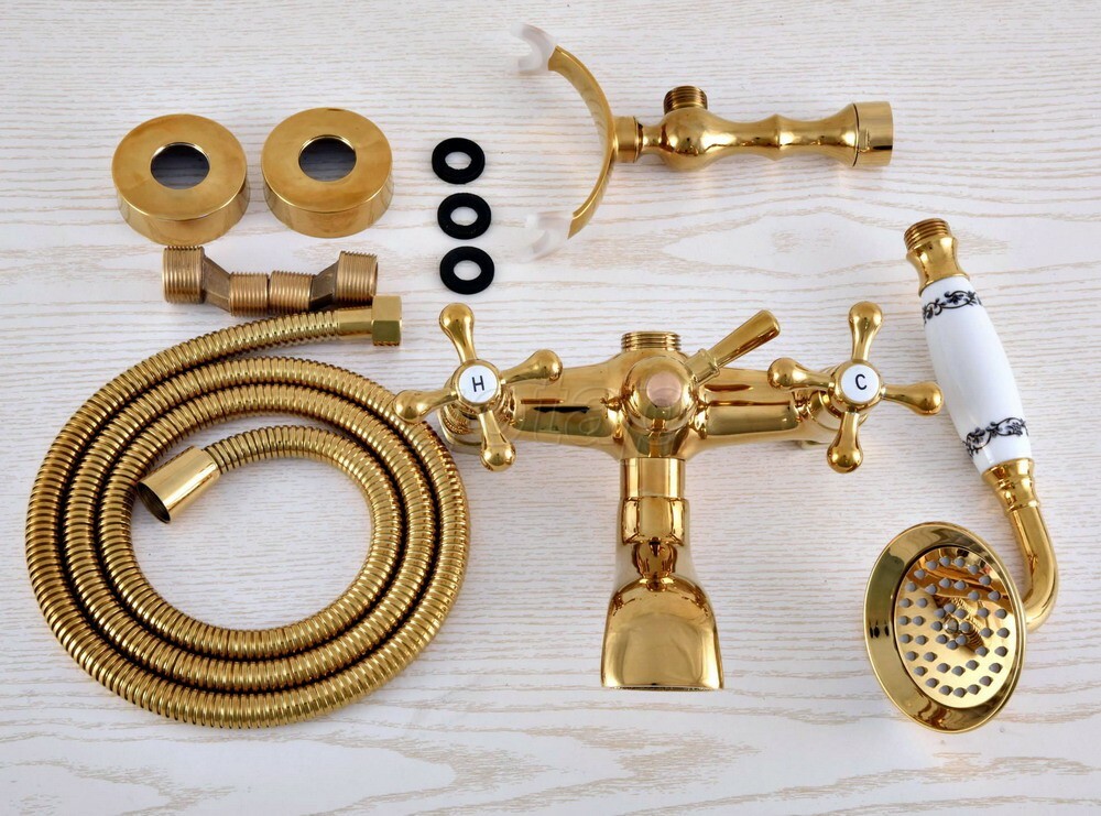 Polished Gold Brass Wall Mount Clawfoot Bath Tub Faucet Tap w/ Handheld Shower