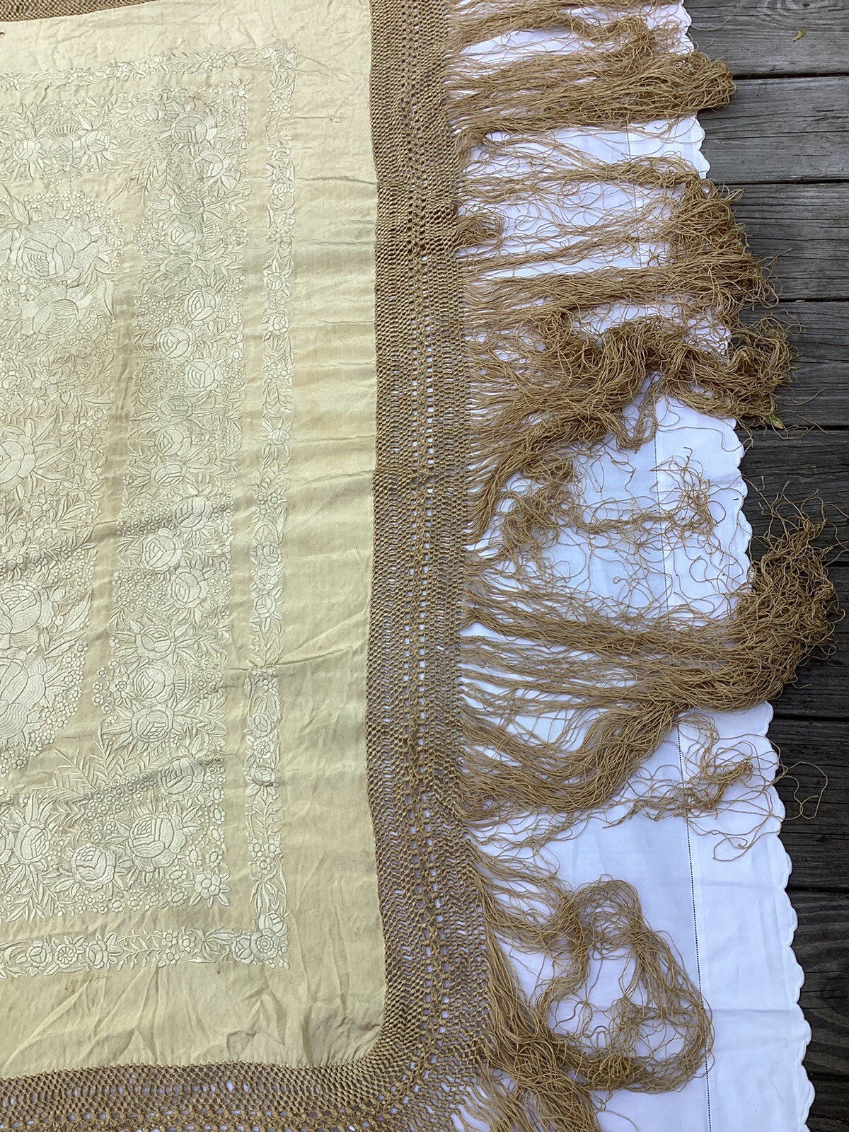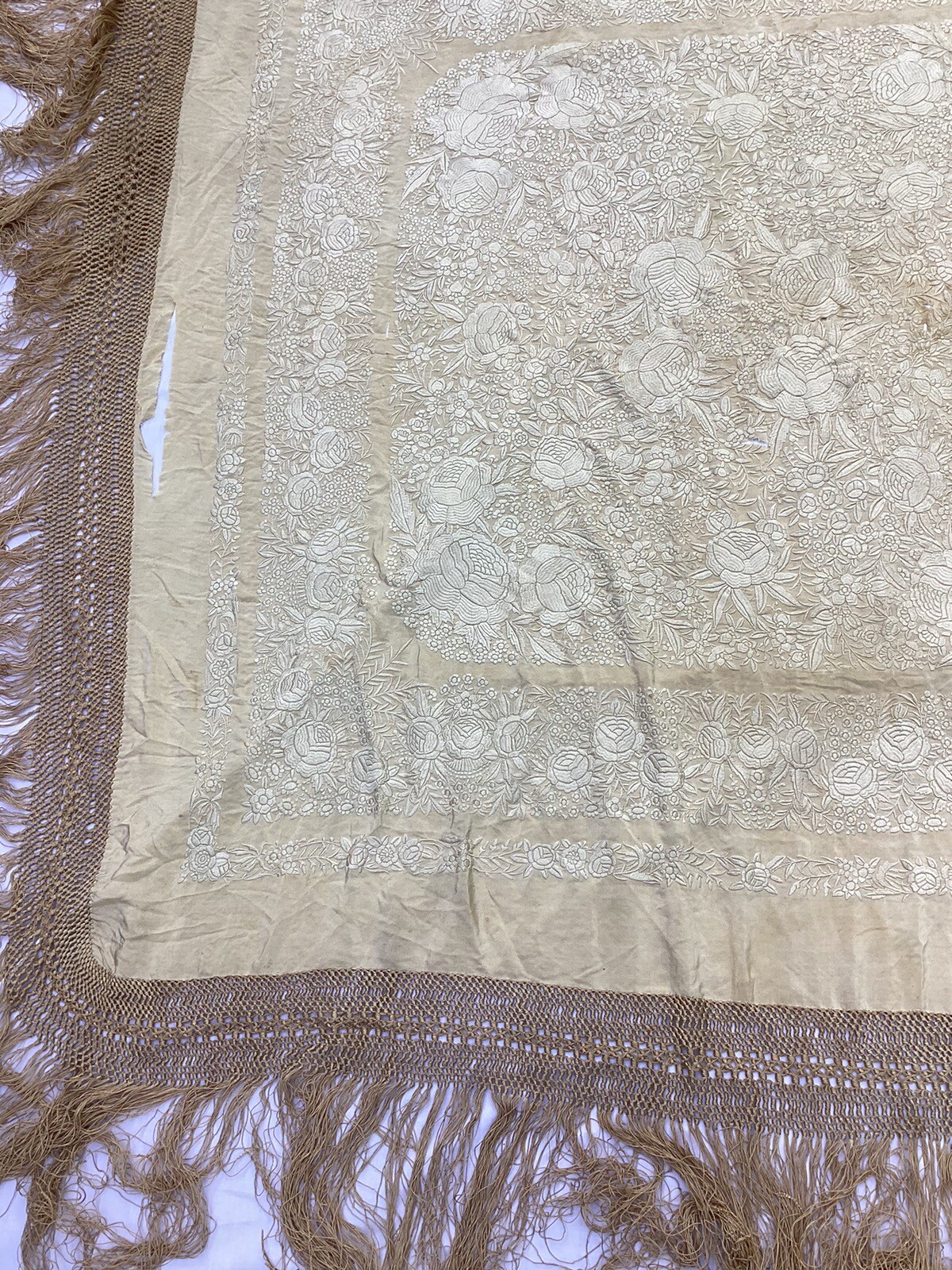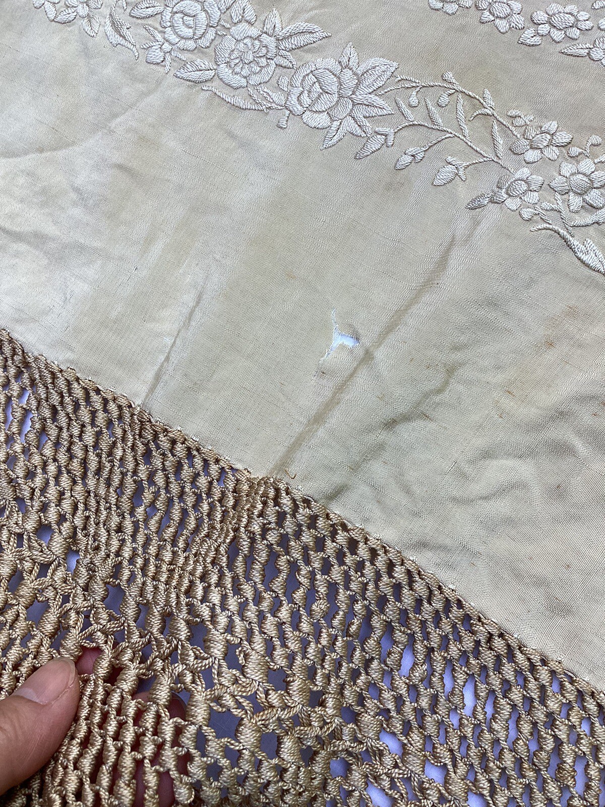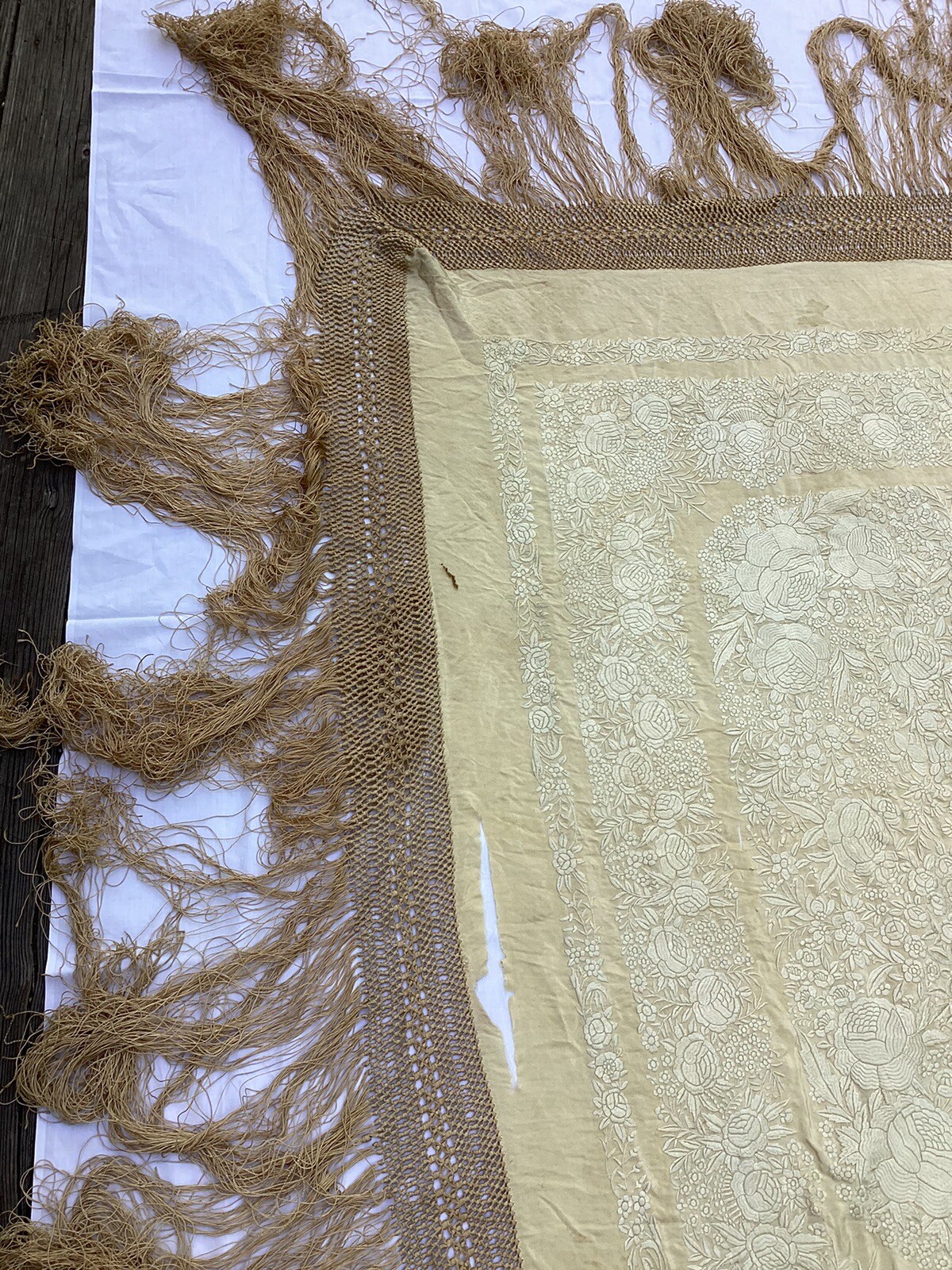 Antique Vintage Silk Floral Embroidered Piano Shawl 54 x58 As Is