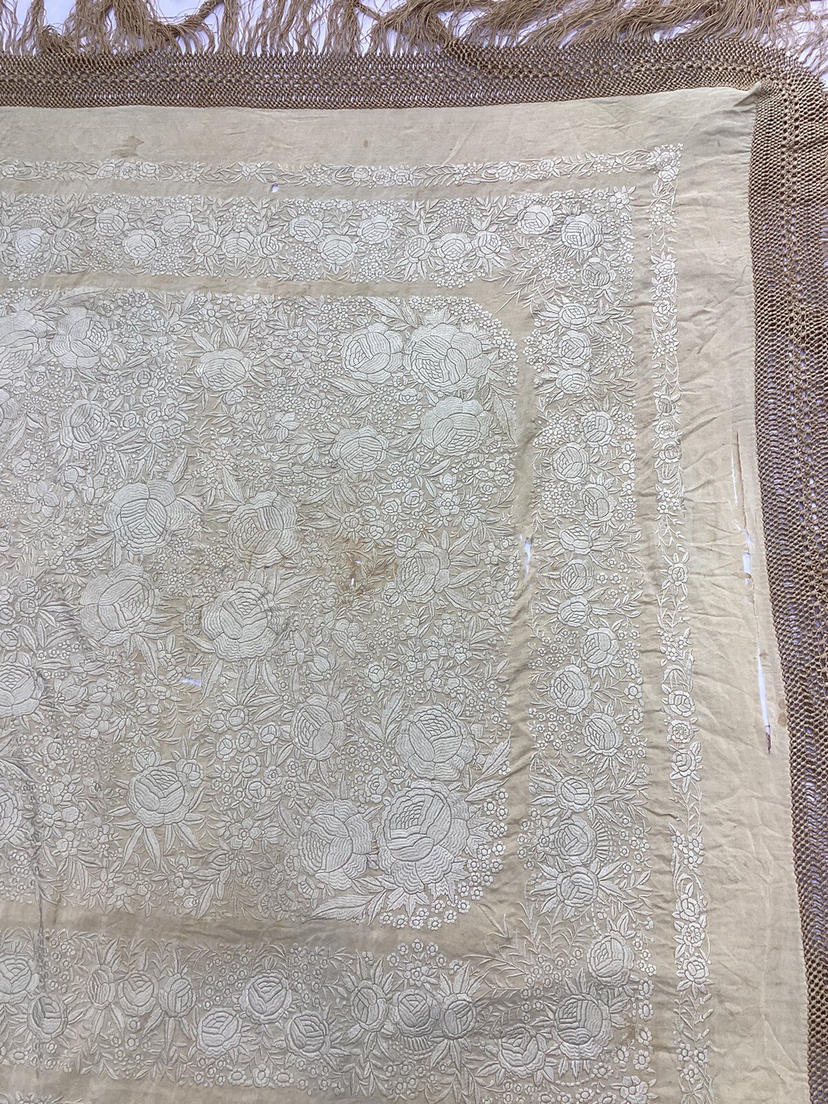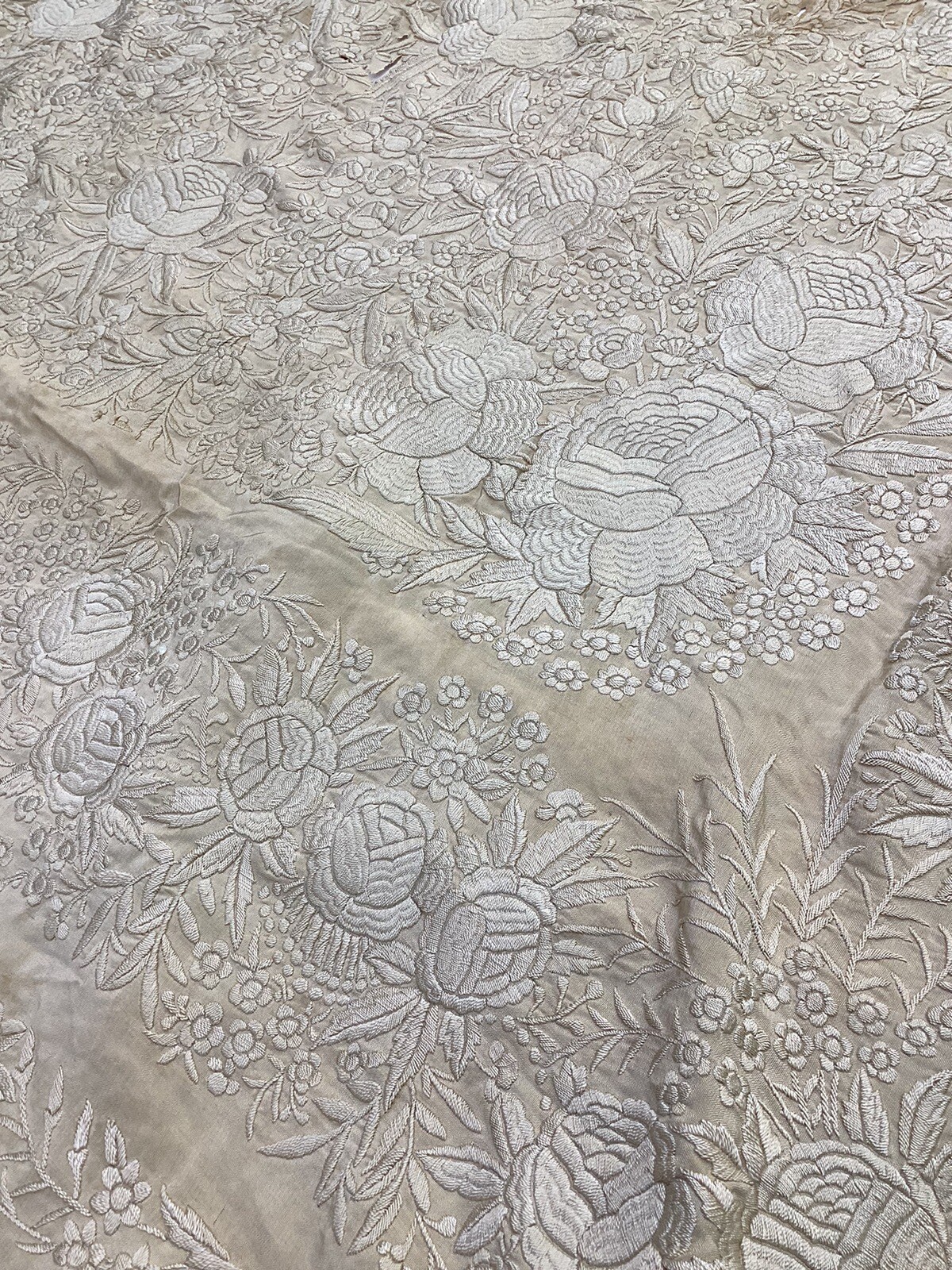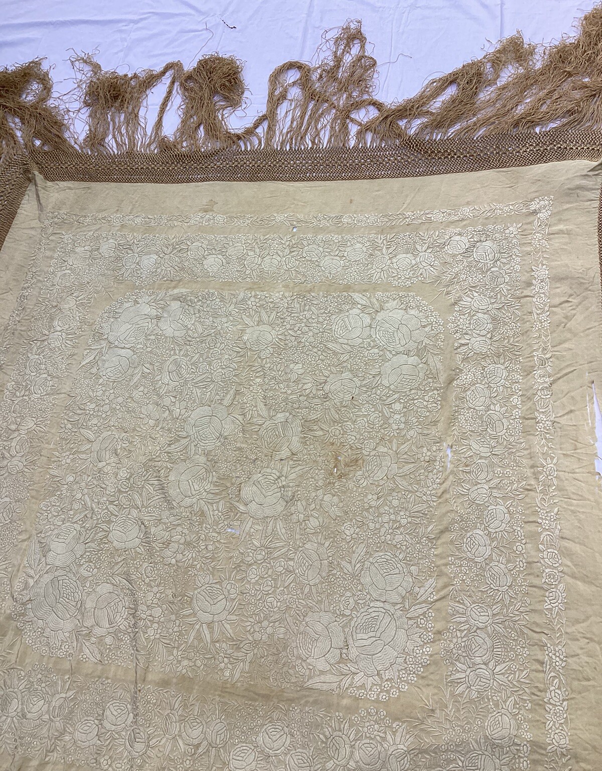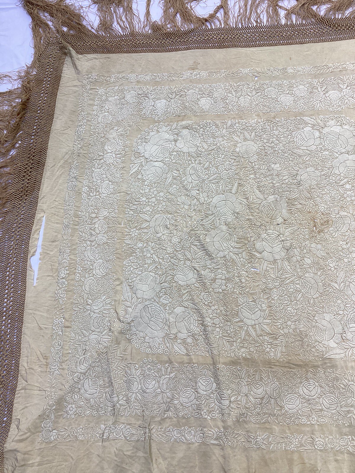 Antique Vintage Silk Floral Embroidered Piano Shawl 54 x58 As Is