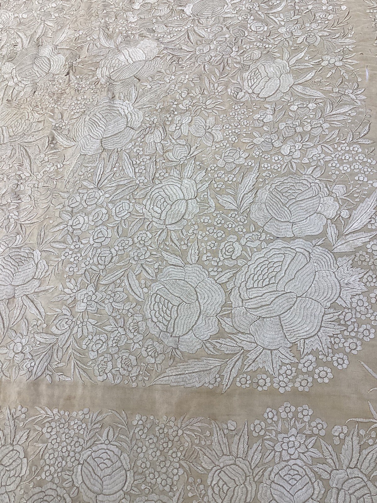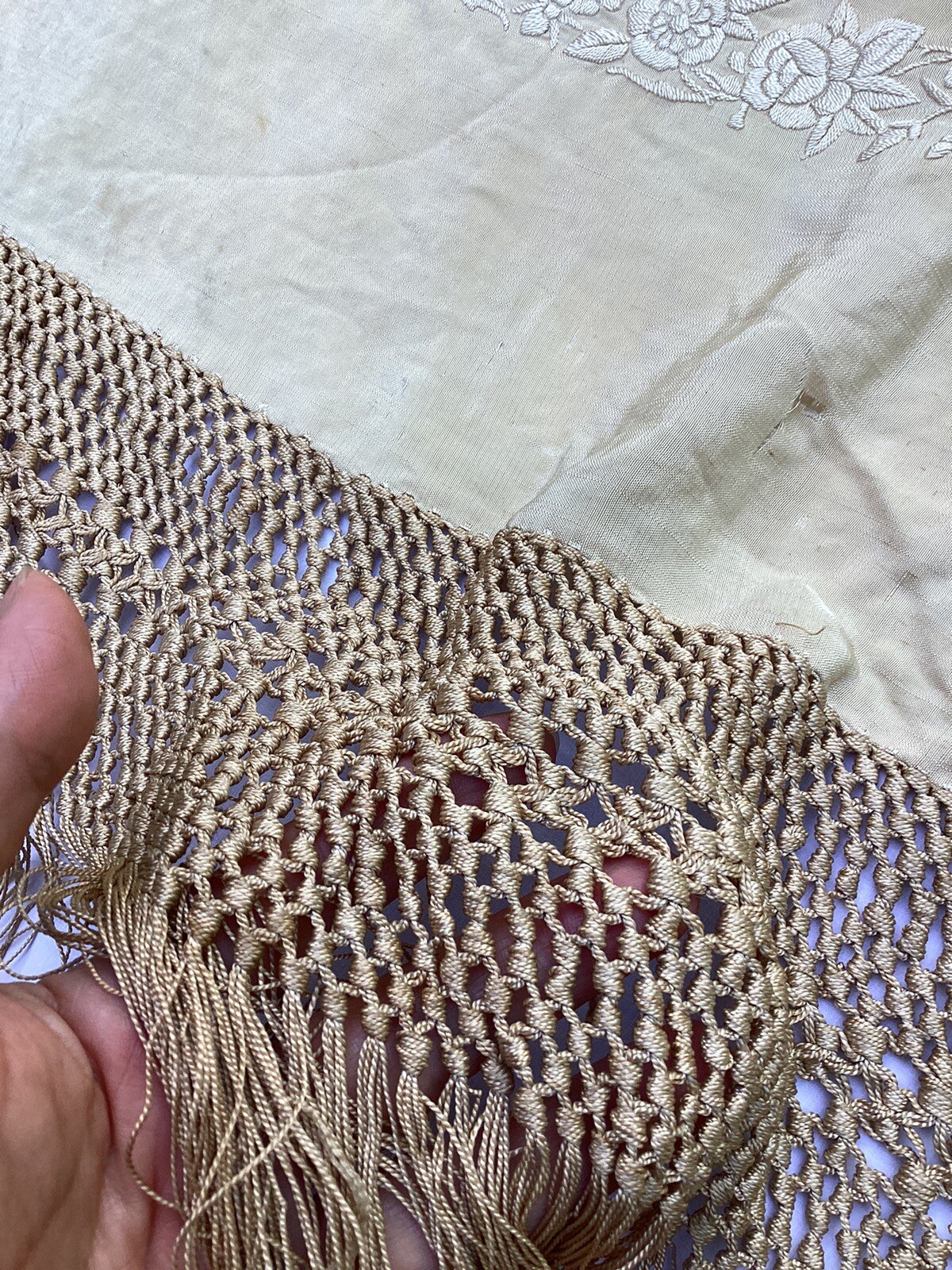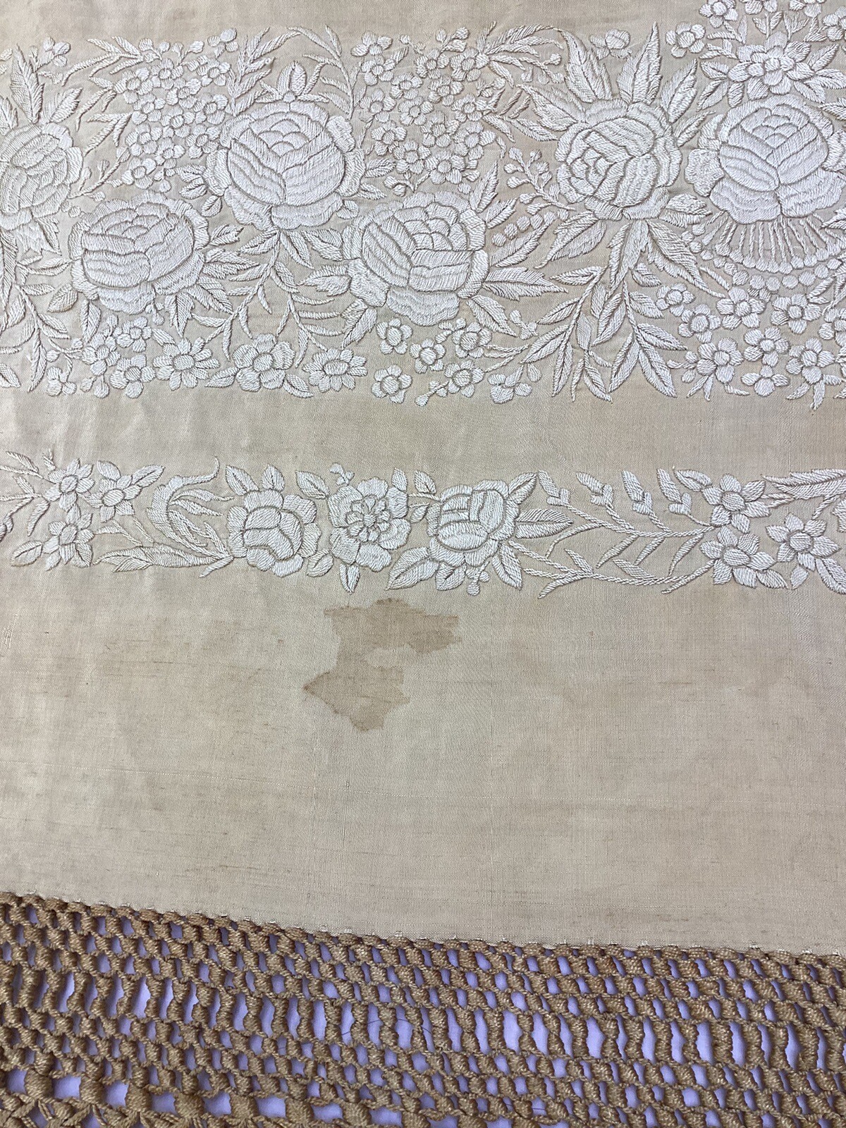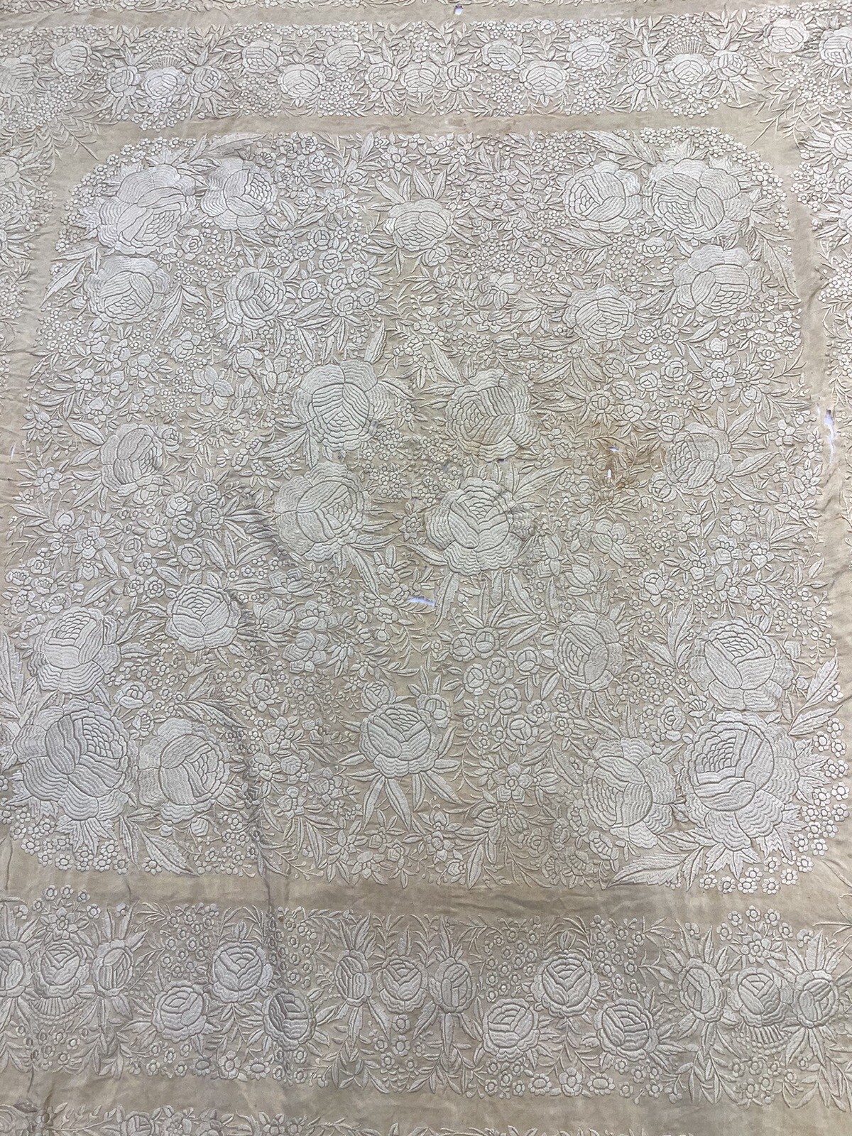 Antique Vintage Silk Floral Embroidered Piano Shawl 54 x58 As Is