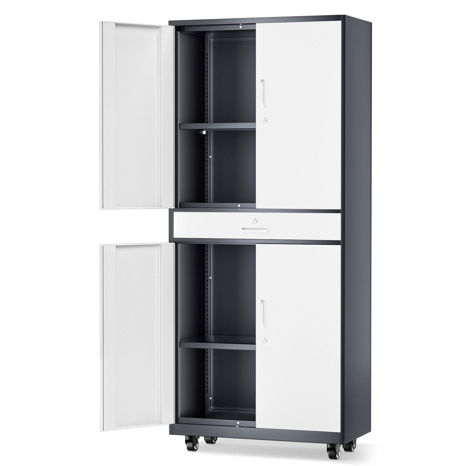 73 Metal Storage Cabinet Adjustable Shelves Door Kitchen Garage Home w/4 Wheels