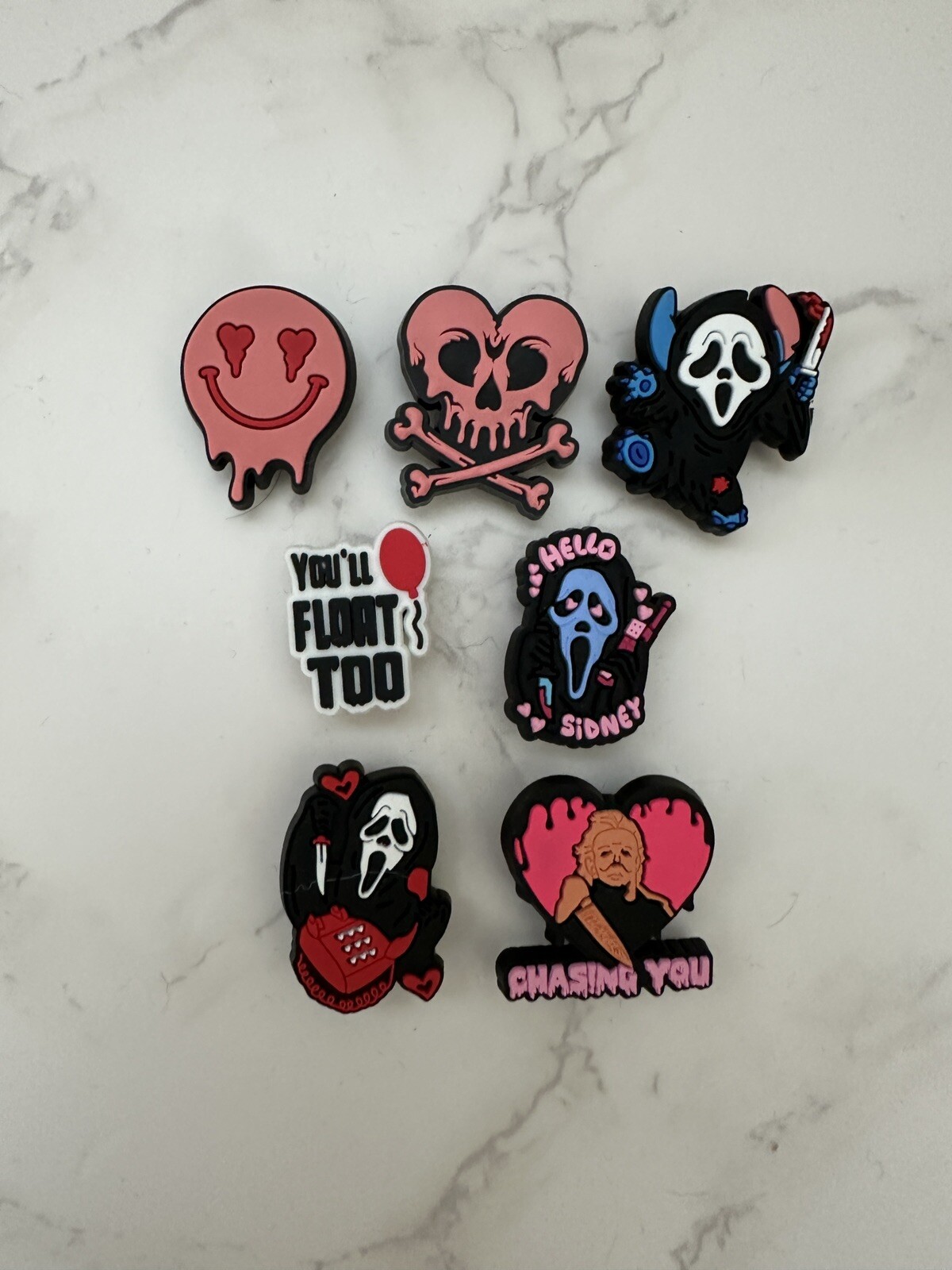 7 Horror Shoe Charms Scary Movie Accessories Fits Crocs Wristband Pink