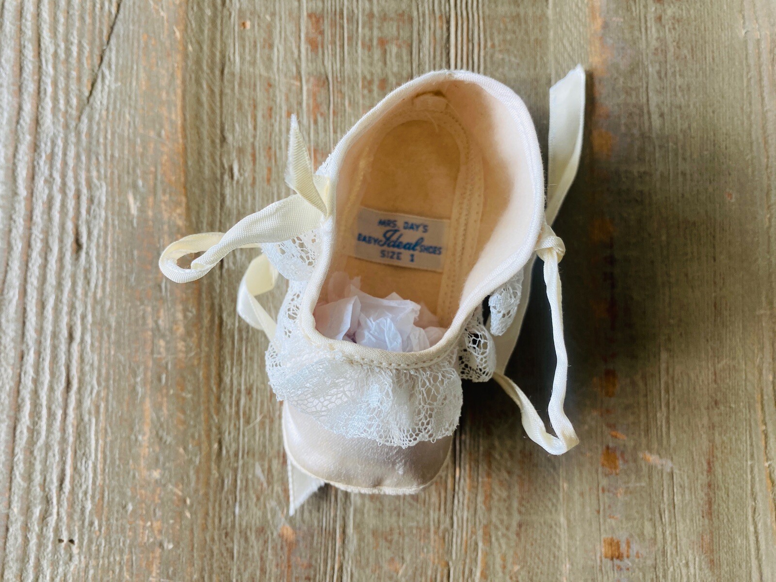 Vtg Mrs. Day's Ideal Baby Shoes Size 1 Ivory with Matching Ivory Sateen Socks