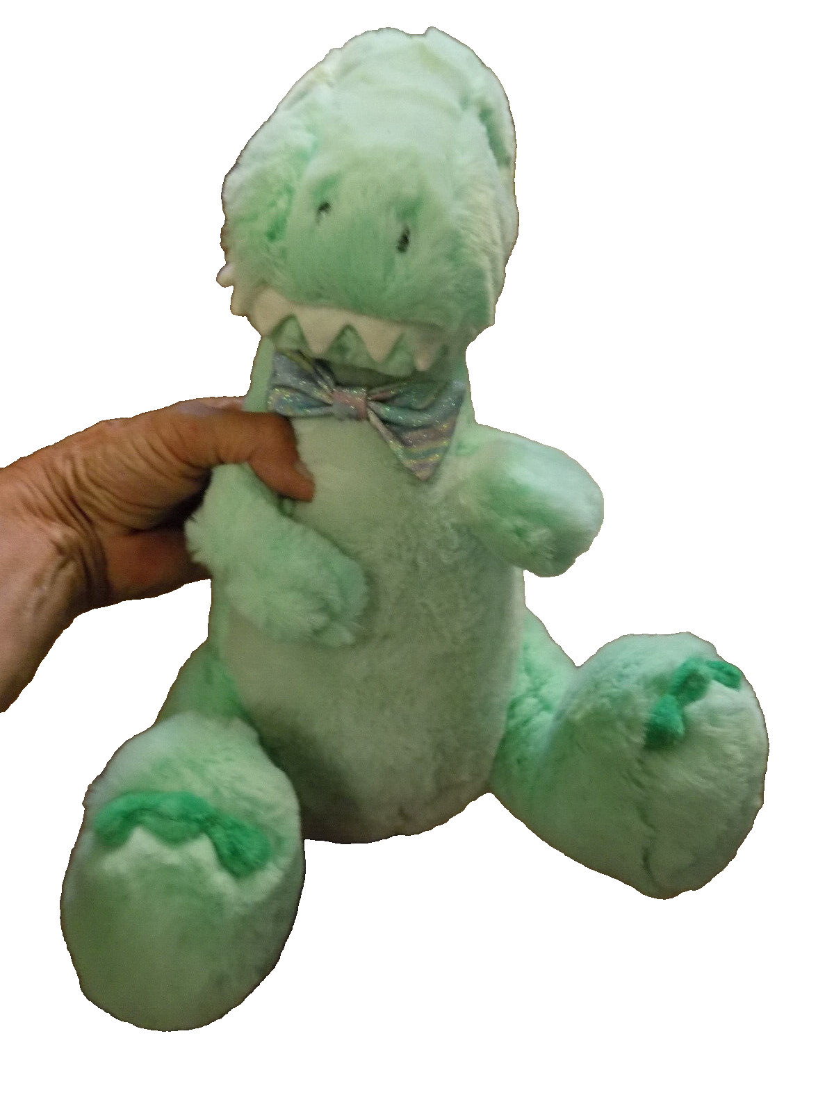 как выглядит FAO Schwarz Plush Light Green Dinosaur w teeth sparkle Bow Tie Sitting 13" EUC фото