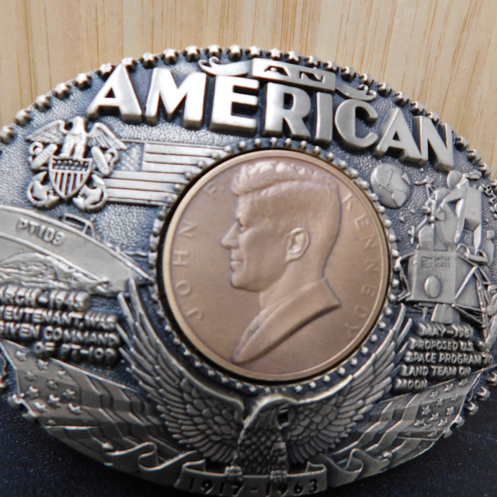 VTG JFK Belt Buckle SOLID BRASS Rainy Mtn Kennedy Coin Eagle Heavy AN AMERICAN