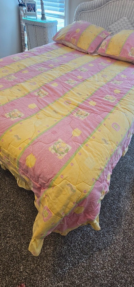 Full Comforter, 2 Shams Pink Yellow Tulips Flowers Ruffled Edges