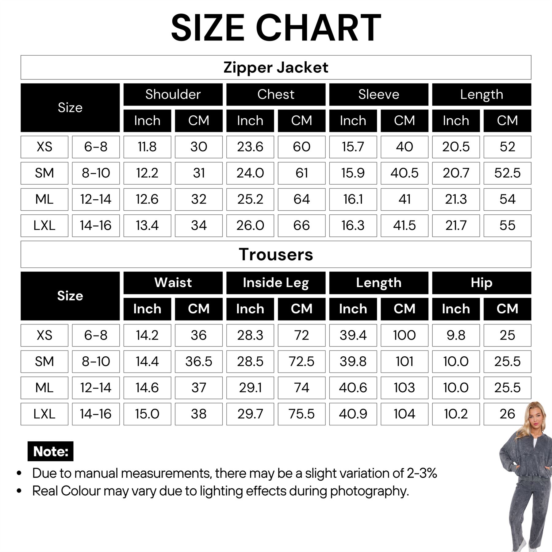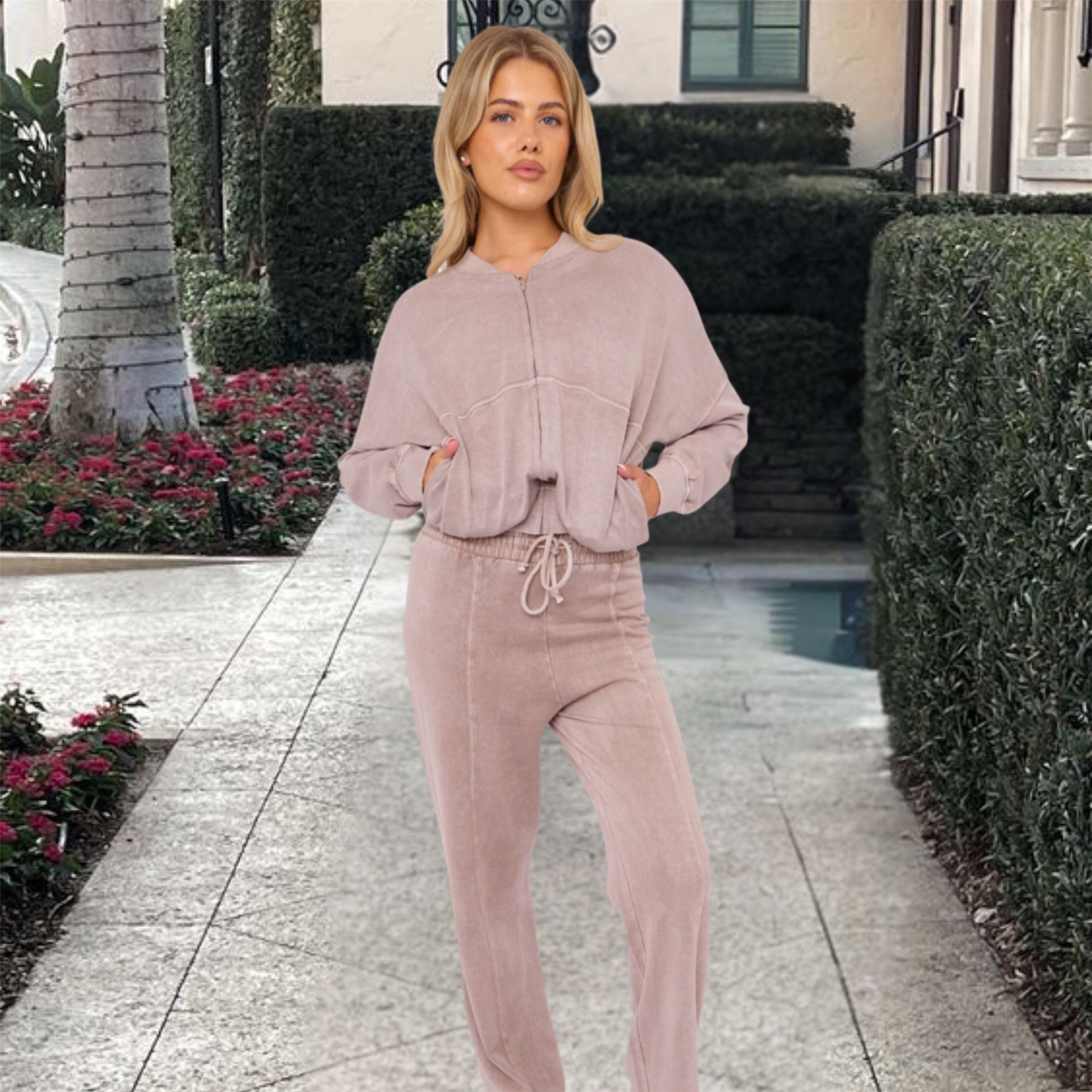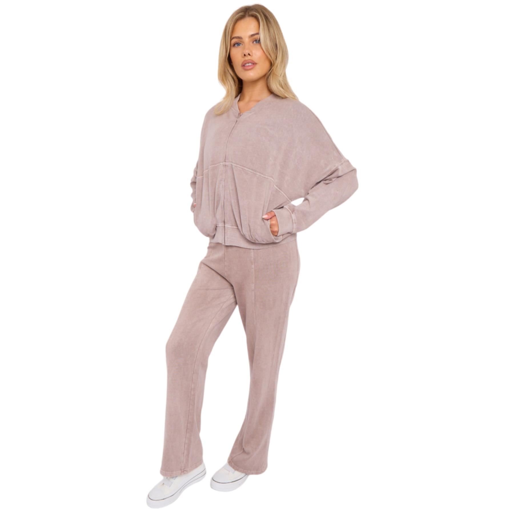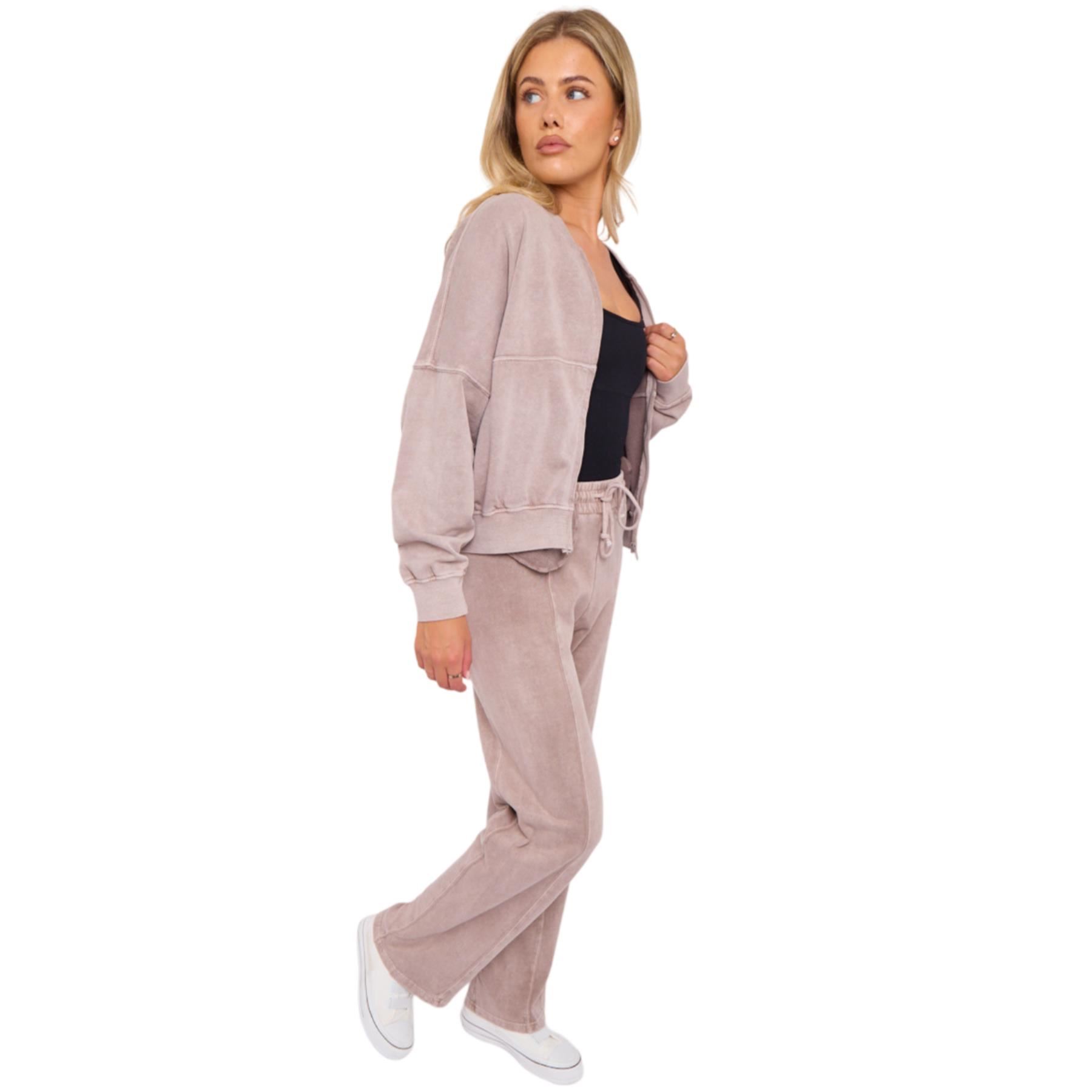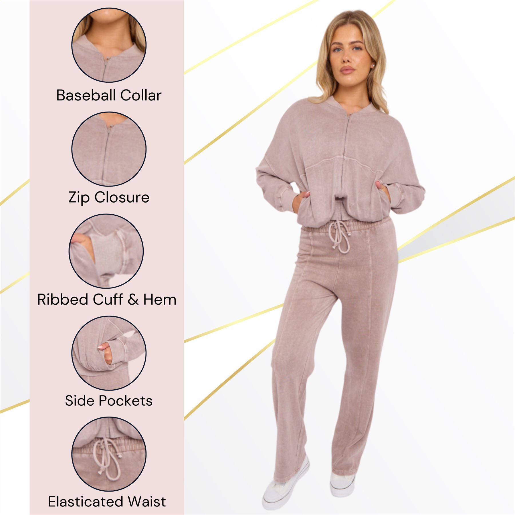Womens Stonewashed Loungewear Oversized Zipper Bomber Jacket 2 Pcs Set Tracksuit