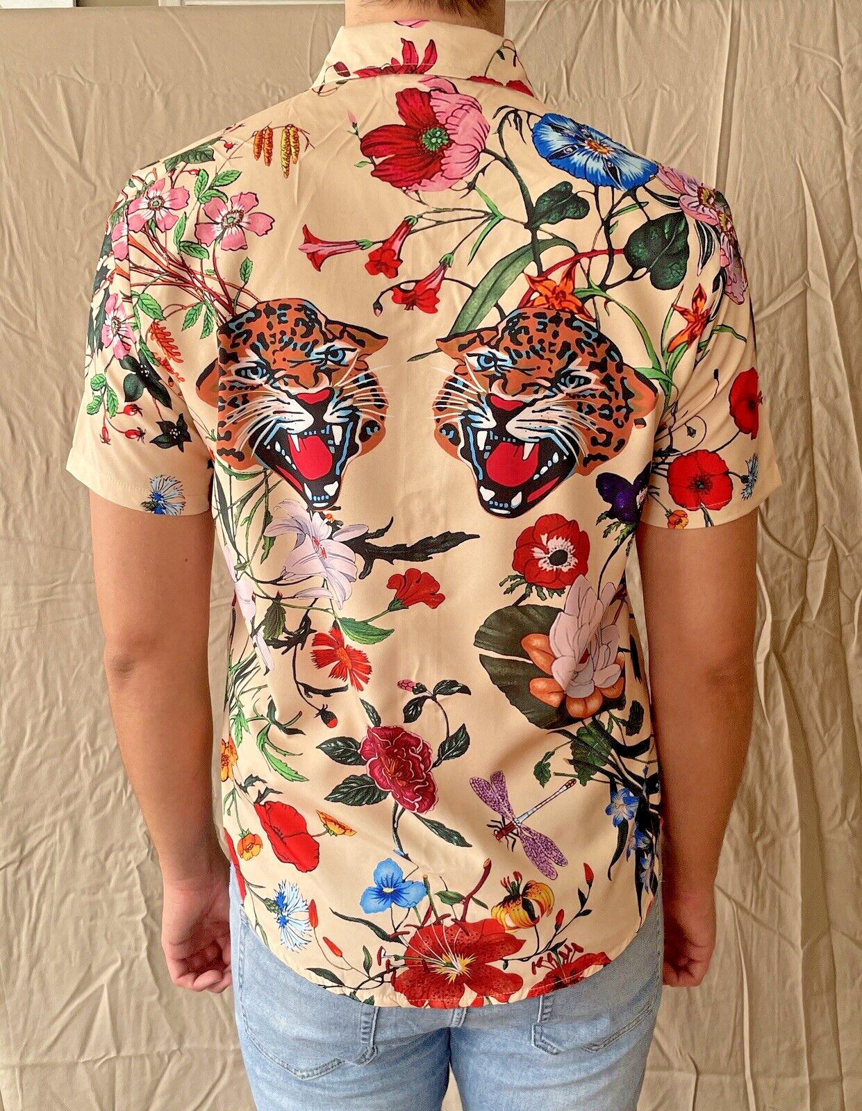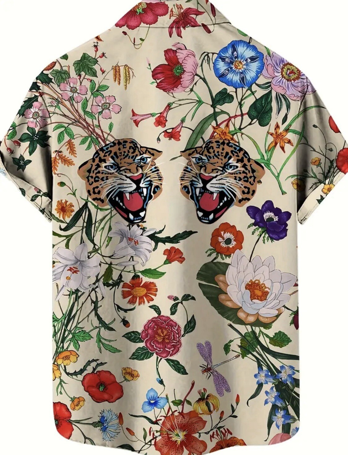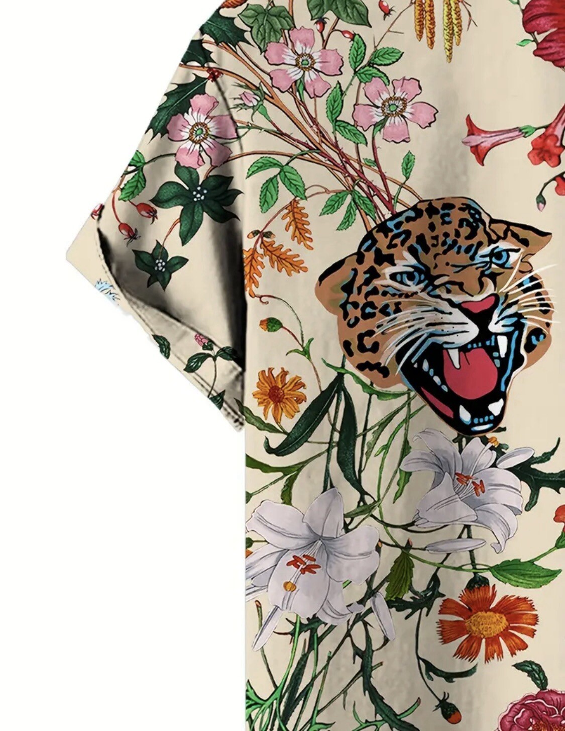 как выглядит Mens Size L Tigers and Flowers Pattern Button Up Short Sleeve Shirt фото