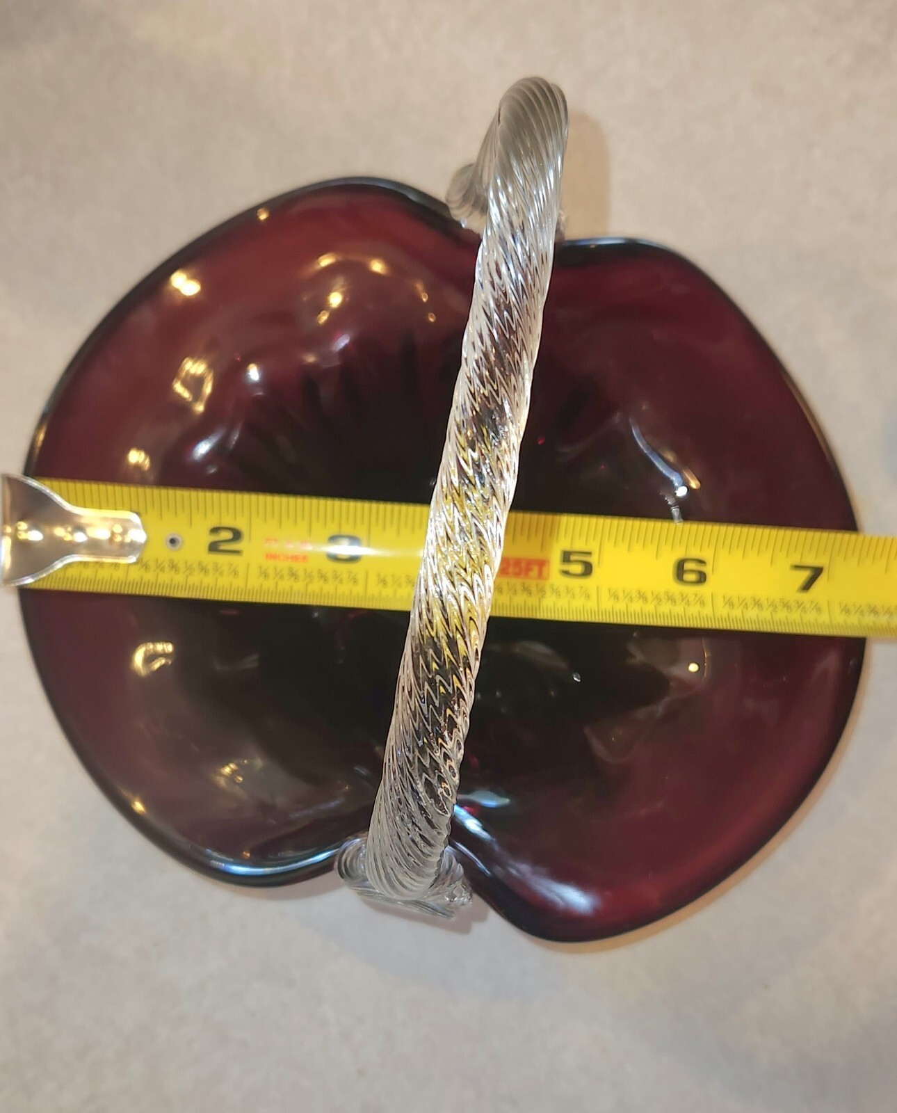 как выглядит Vintage Ruby Red Hand Blown Art Glass Basket Handle Clear Ground Base фото
