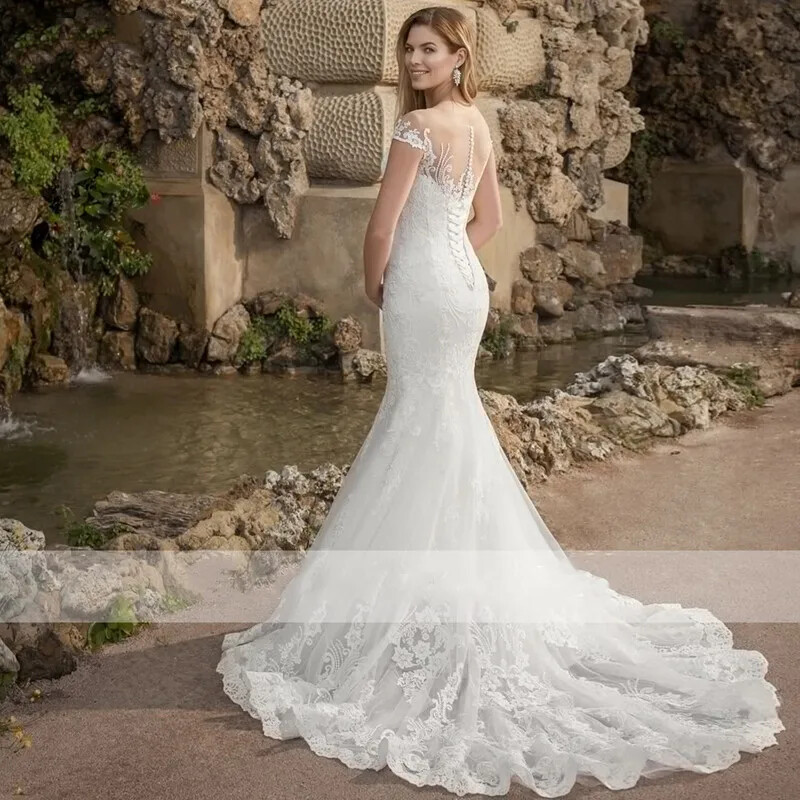 Elegant Mermaid Wedding Dress Off Shoulder Lace Up Back Lace Applique Bride Gown