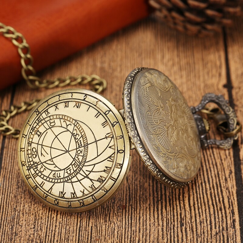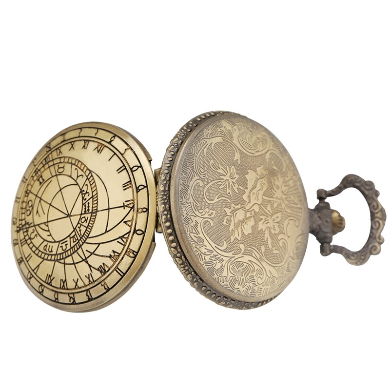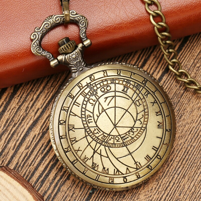 Mens Bronze Steampunk Compass Design Quartz Pocket Watch with Pendant Chain Gift