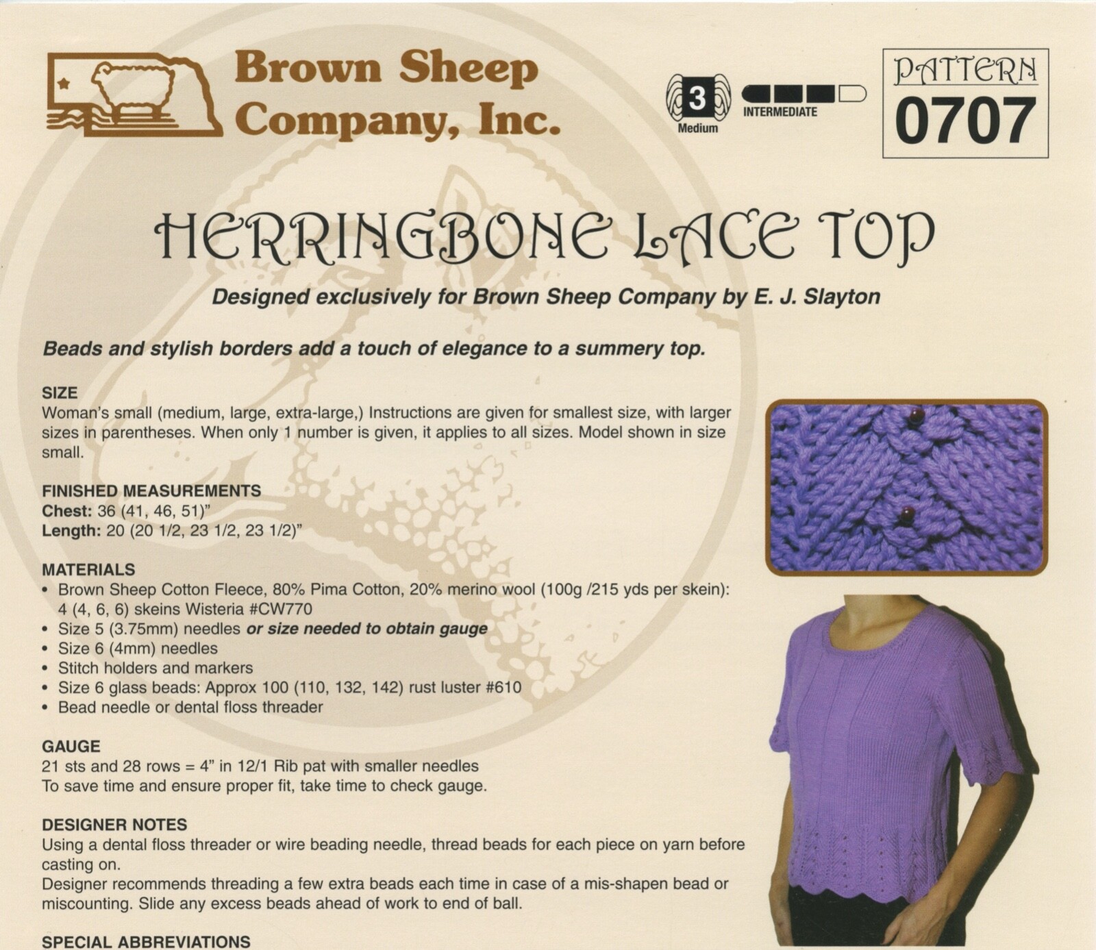 Brown Sheep Company Knitting Pattern 0707 Beaded Herringbone Lace Top Women