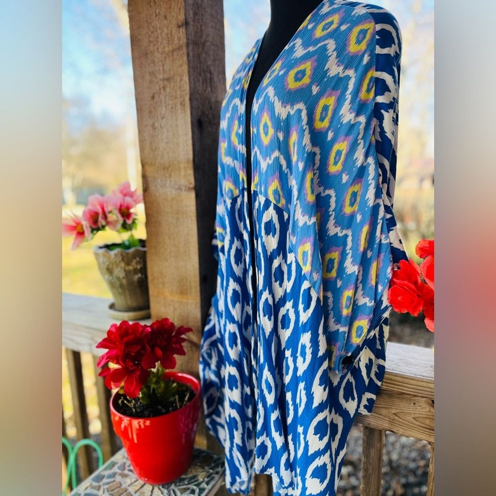 как выглядит Kori America Oversized Loose Boho Gypsy Blue/Pink Soft Crepe Kimono Duster фото