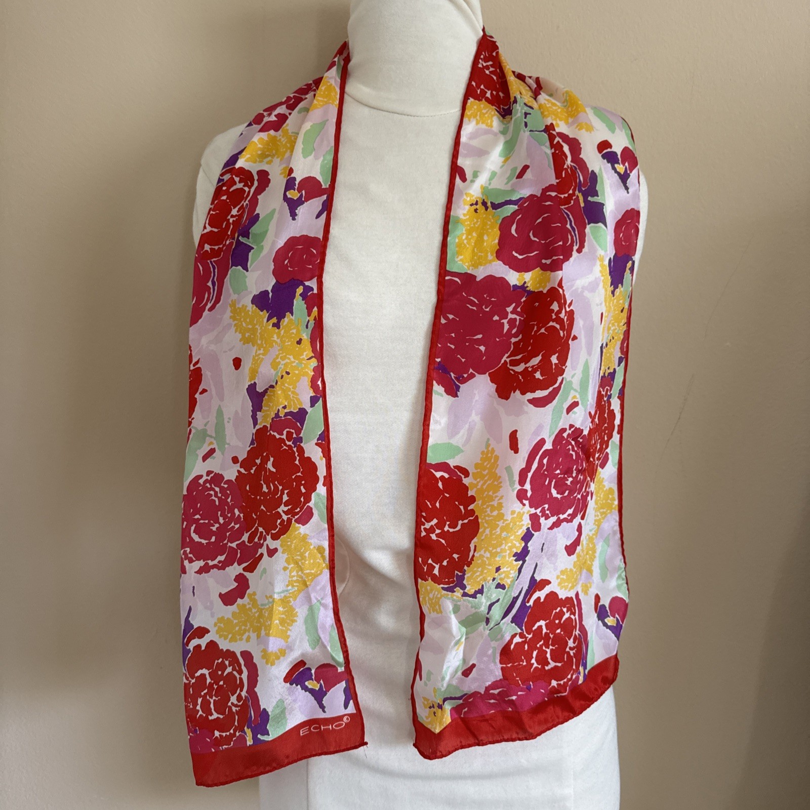 как выглядит Vtg ECHO Red Fuschia Tellow Floral Silk Scarf Oblong 52" Japan фото