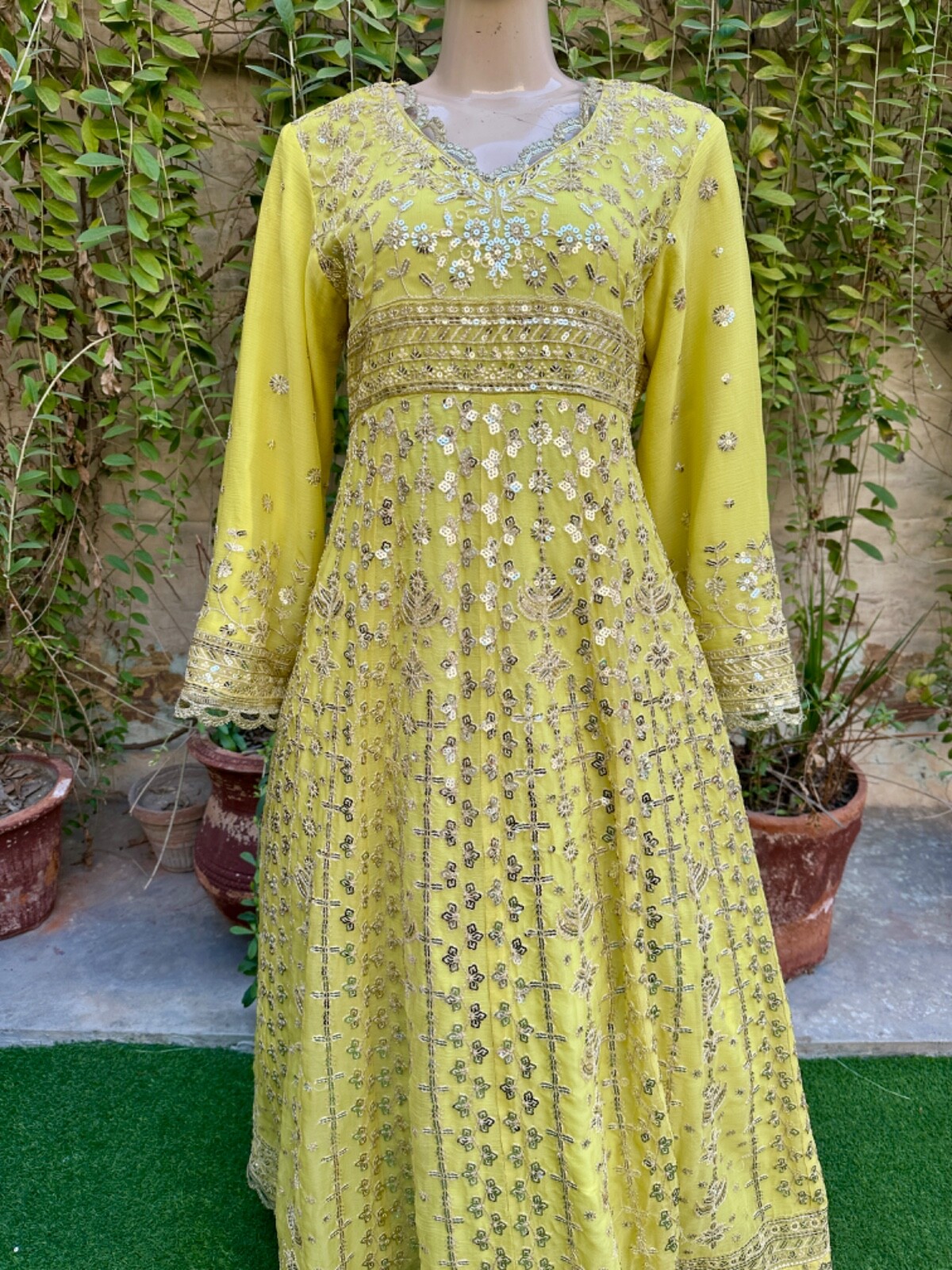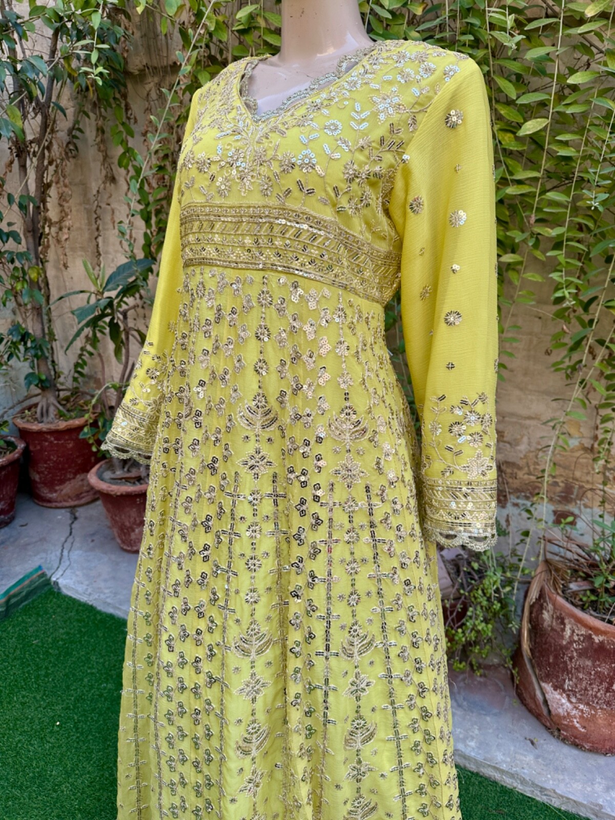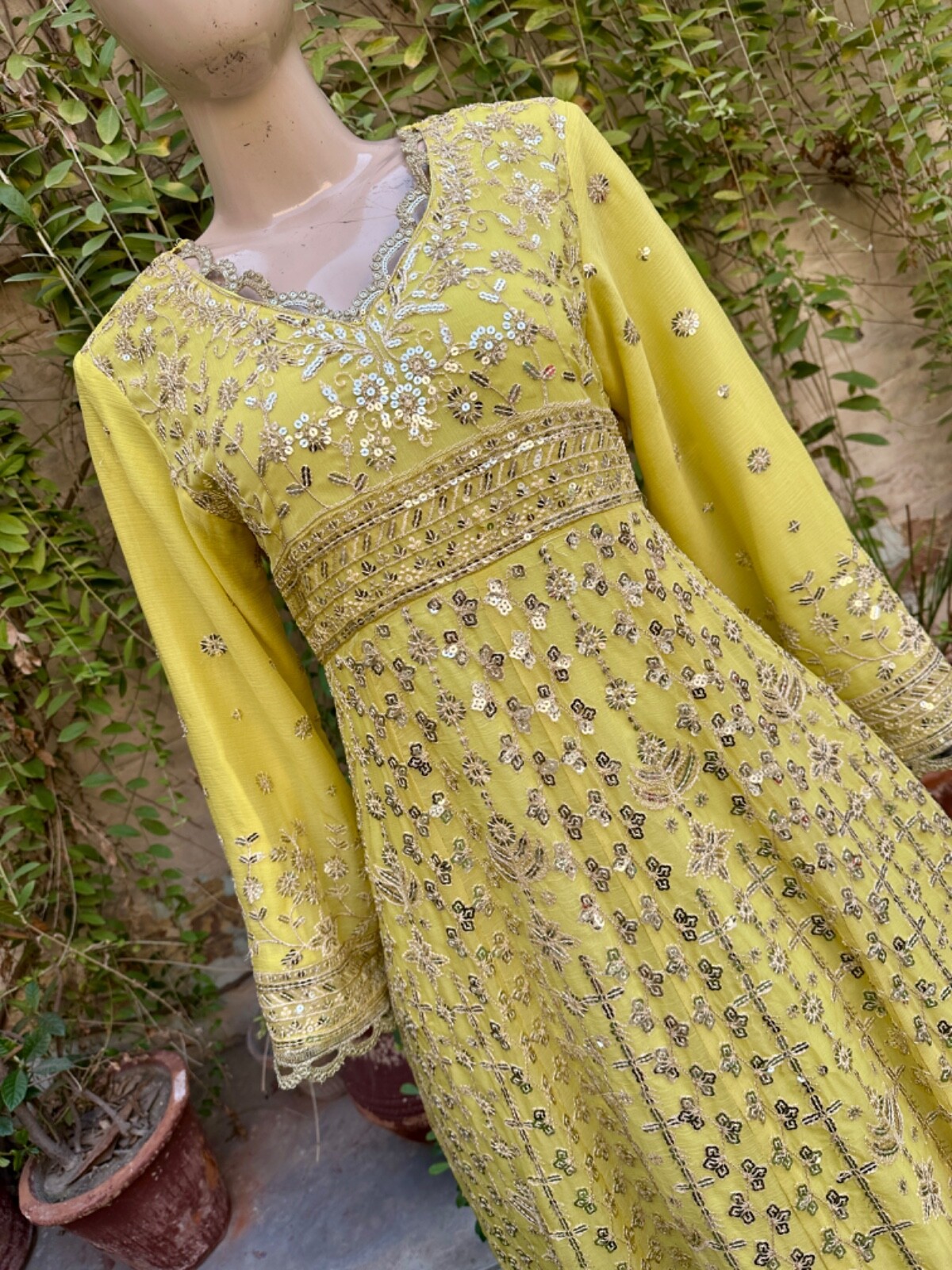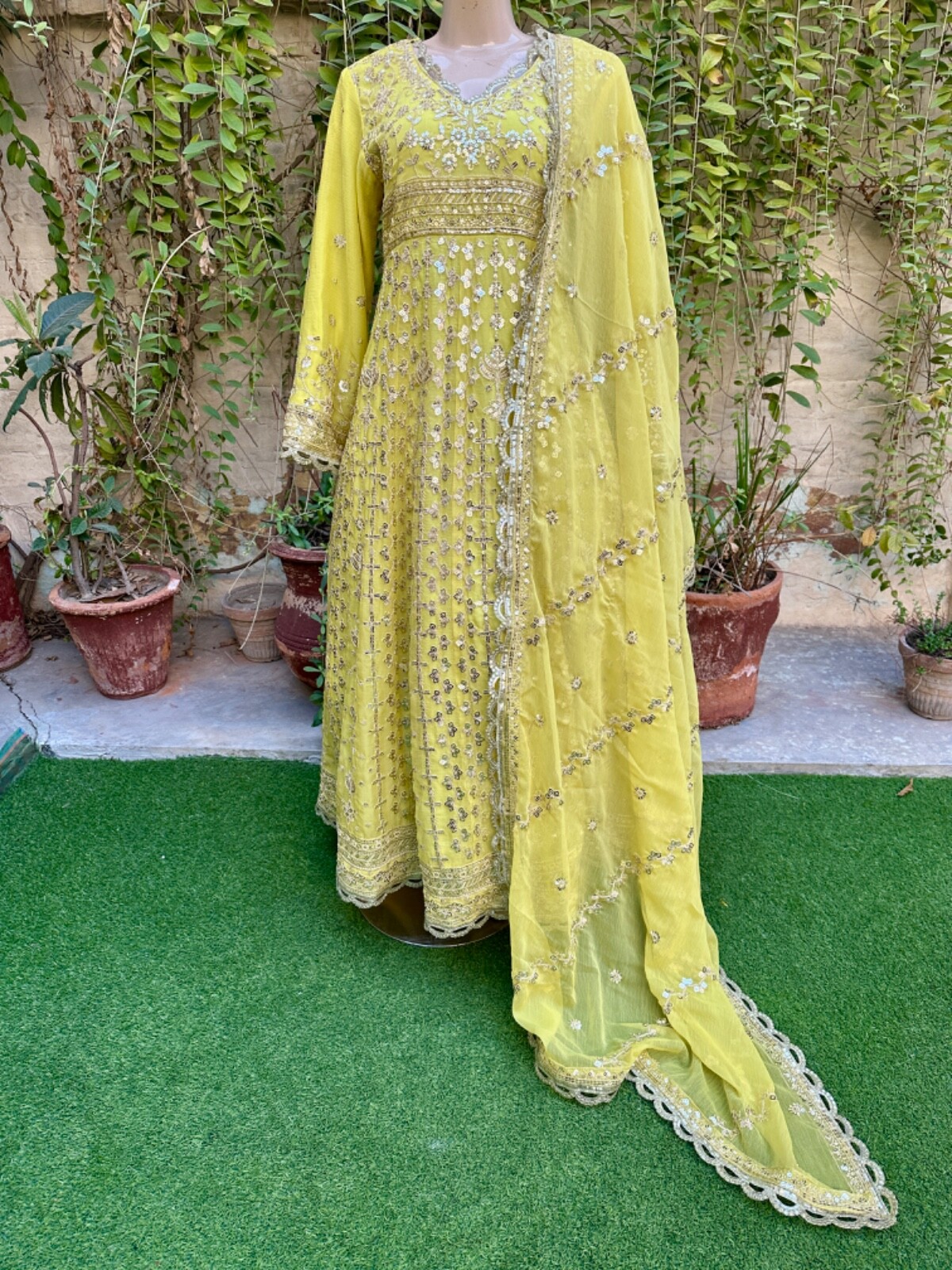 как выглядит Pakistani Light Yellow Long Maxi Style Embroidered Sequins Chiffon Dress,XL фото