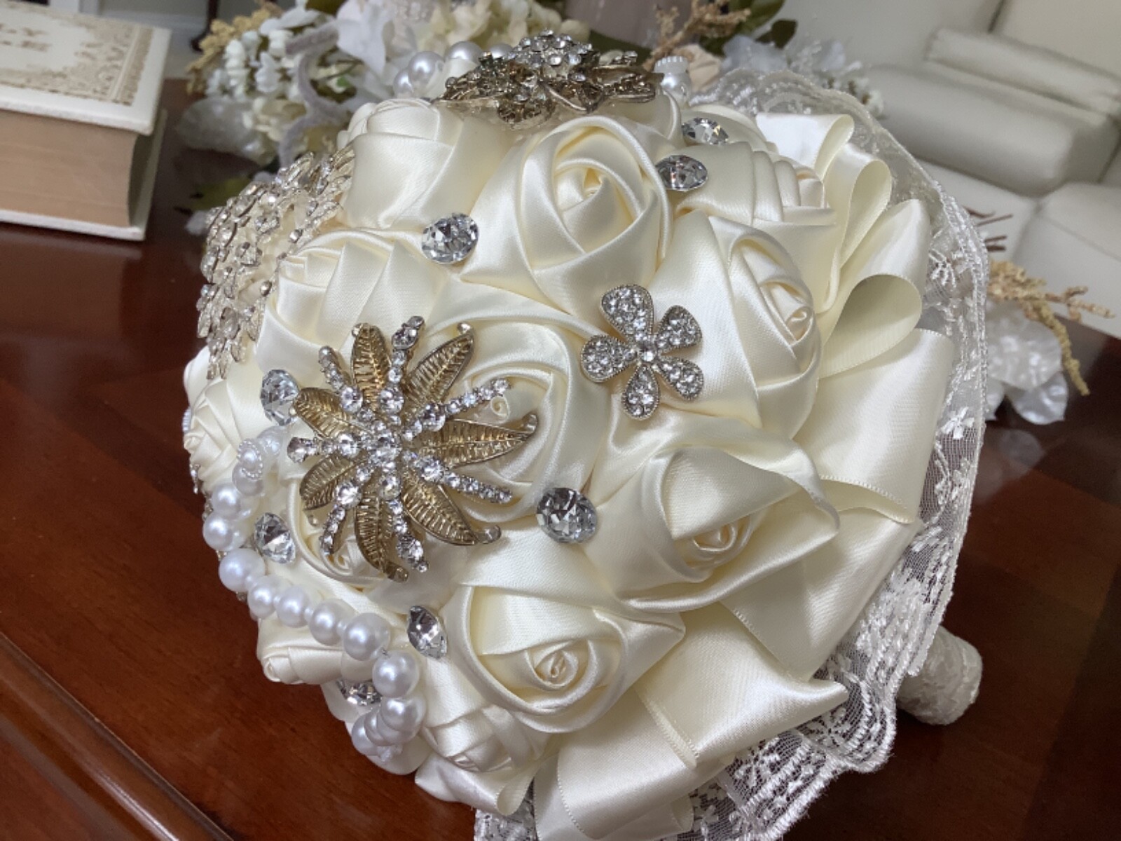 Beautiful White Wedding Brooch Bouquet Gems Pearl Bridal Satin Rose Flowers