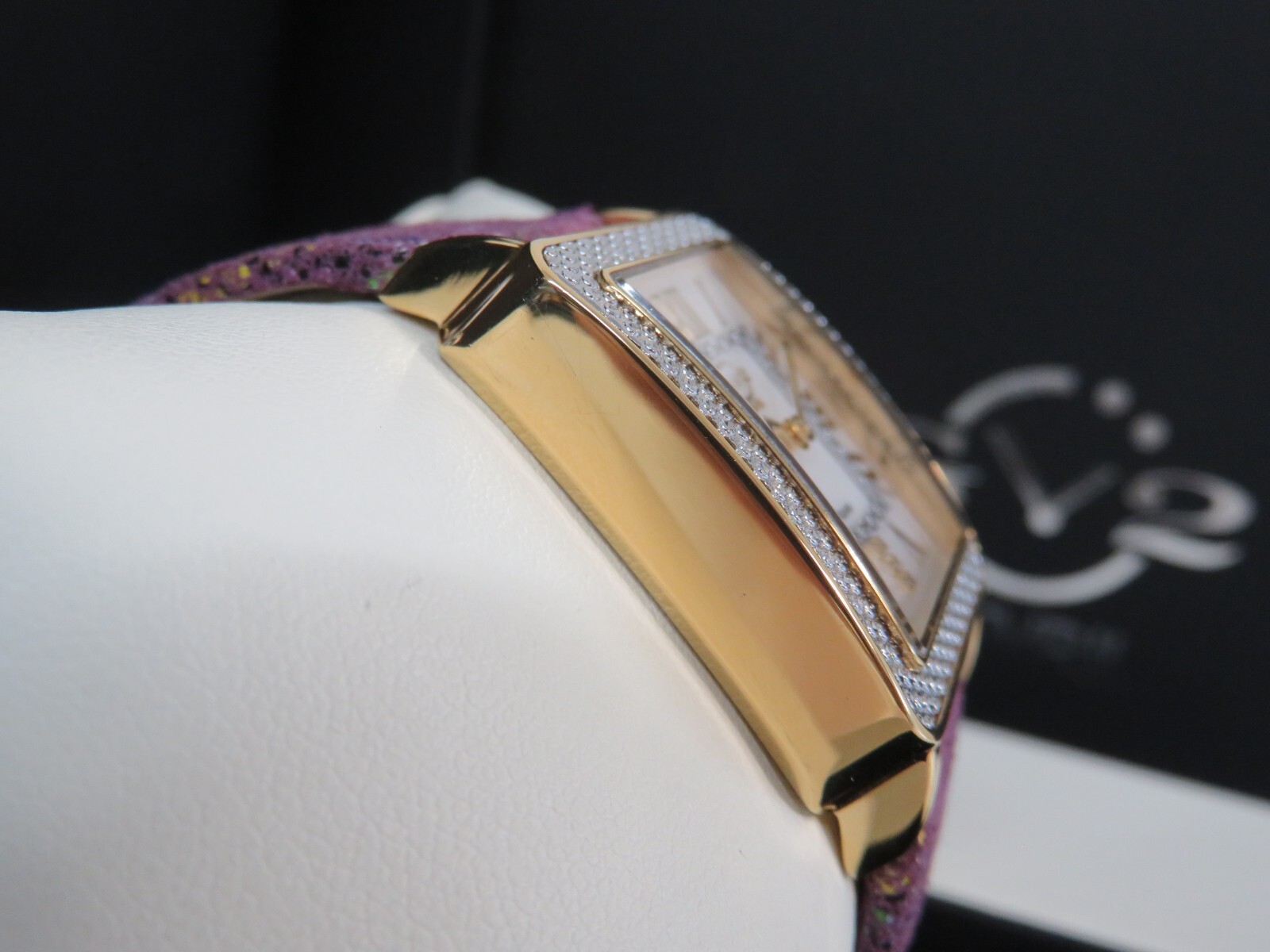Особенности: Swiss Movement Ronda 762, 27.5 mm Rectangle Yellow Gold Case, Push Pull crown, Stunning White MOP dial, Diamond Cut ring on dial, 3 Diamonds at 6.00, Genuine Purple Floral Hand Made Italian Leather Strap, Anti-reflective Sapphire Crystal, Water Resistant to 30 Meters/3ATM