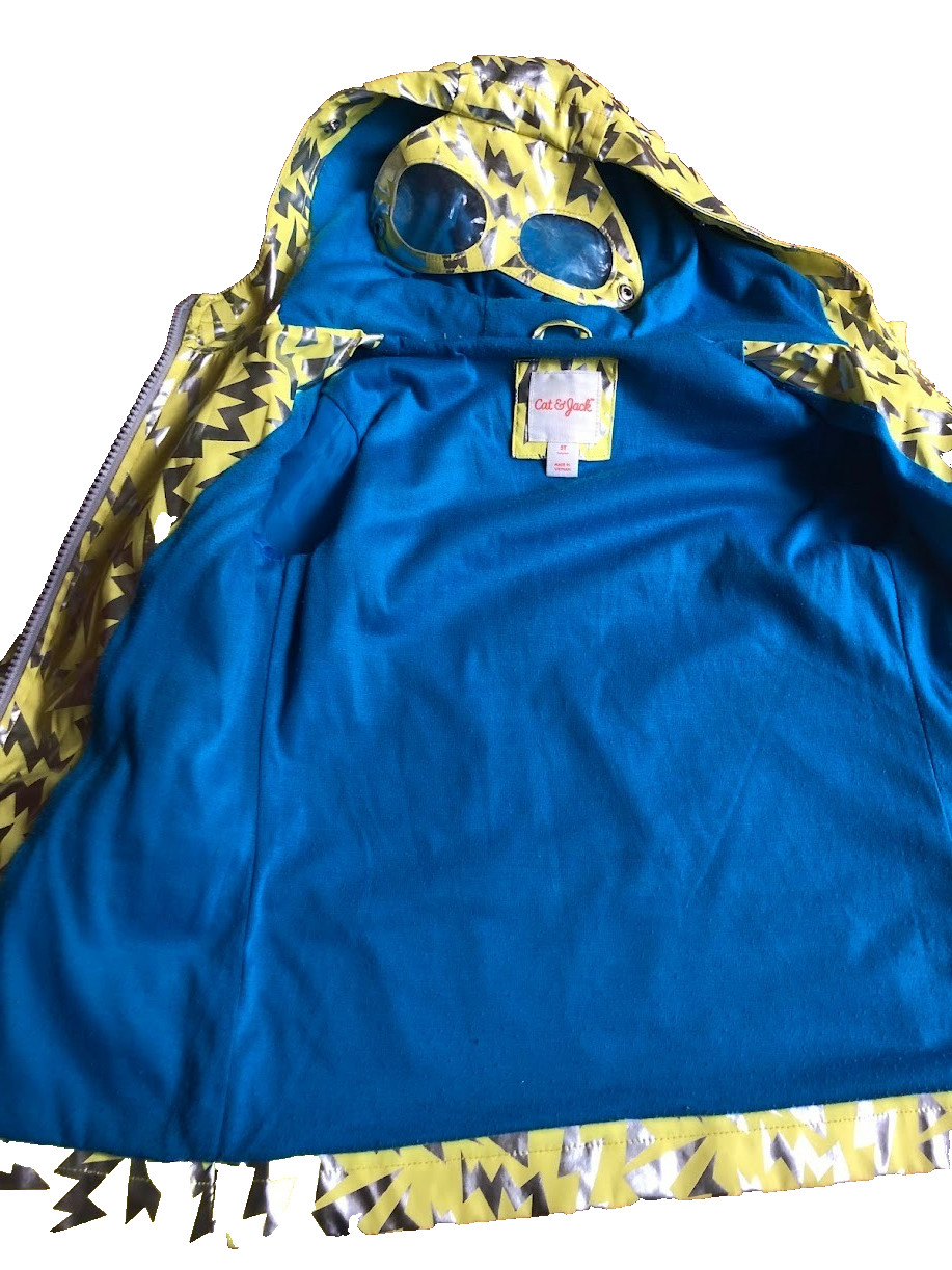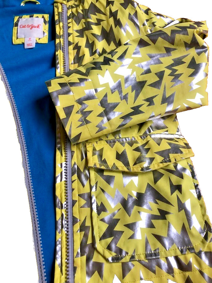 Size 5T Kids Cat Jack Yellow Silver Super Hero Raincoat Jacket W/Hood Mask