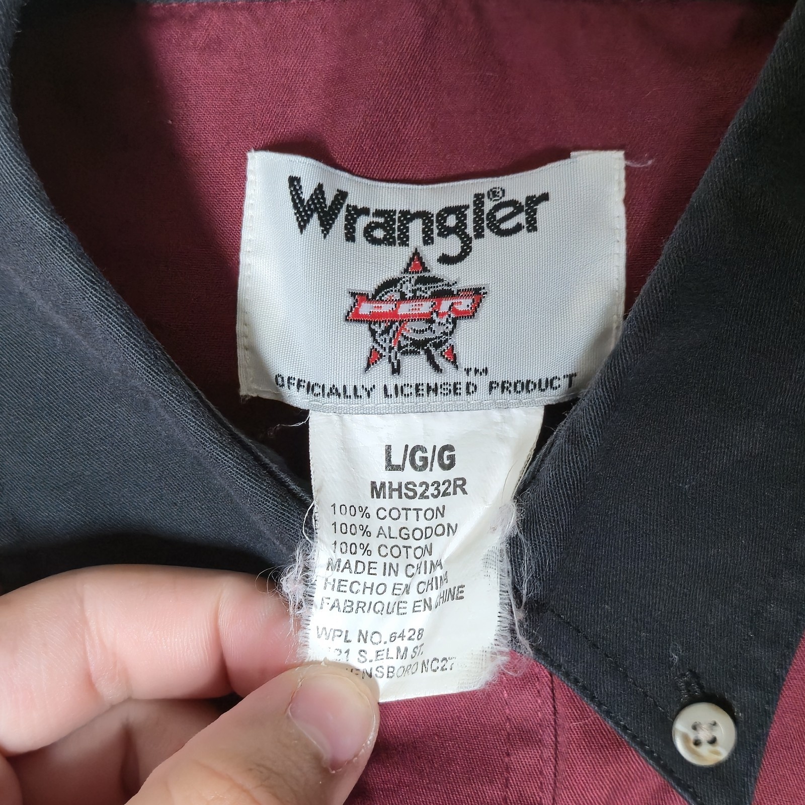 Wrangler PBR Shirt Mens L Burgandy Red Tan Collar Western Rodeo Cowboy