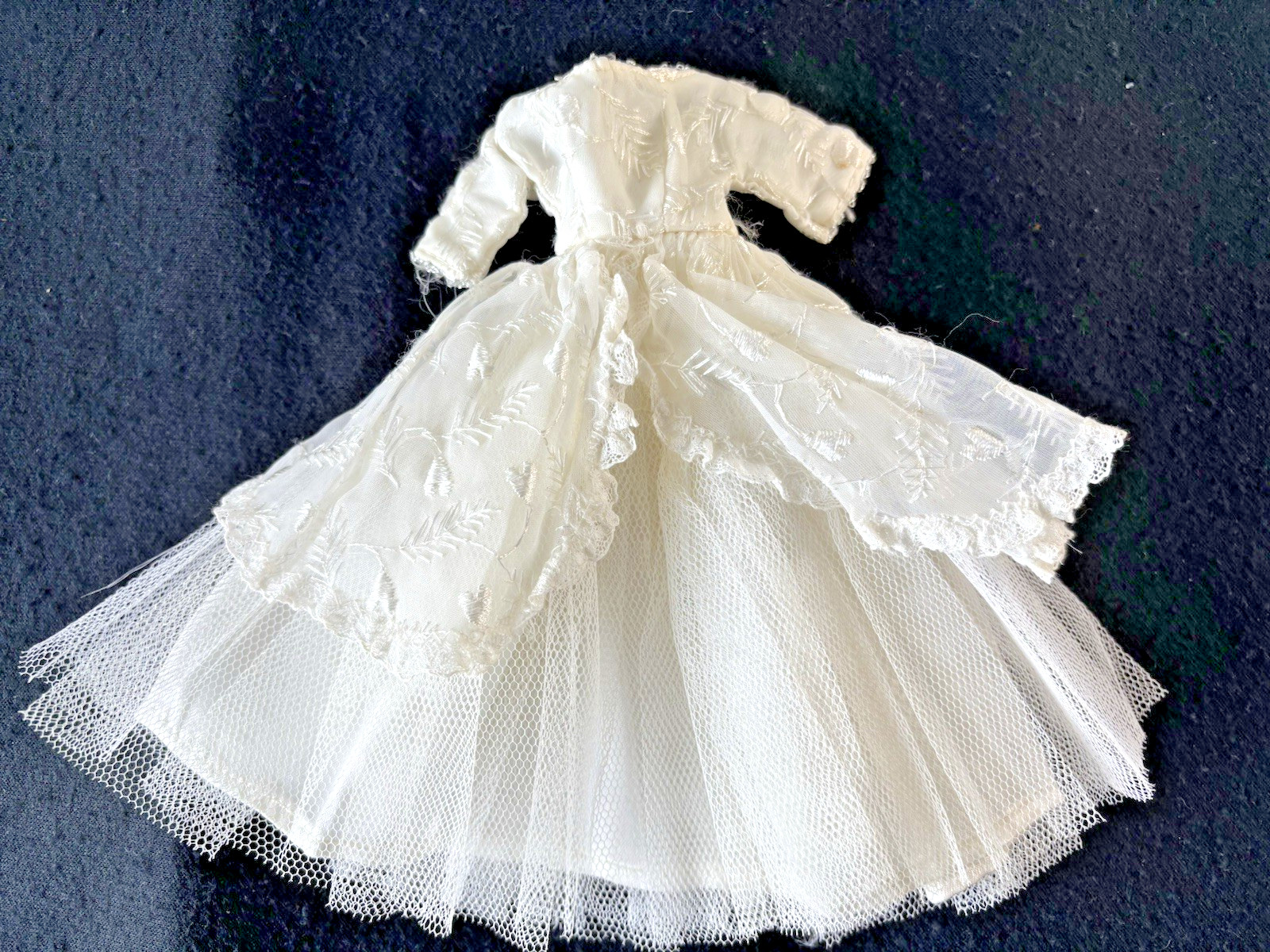 VTG VERY SM BRIDAL GOWN, DUTCHESS SATIN, EMBROID, TULLE OVERSKIRTS, LONG SLEEVES