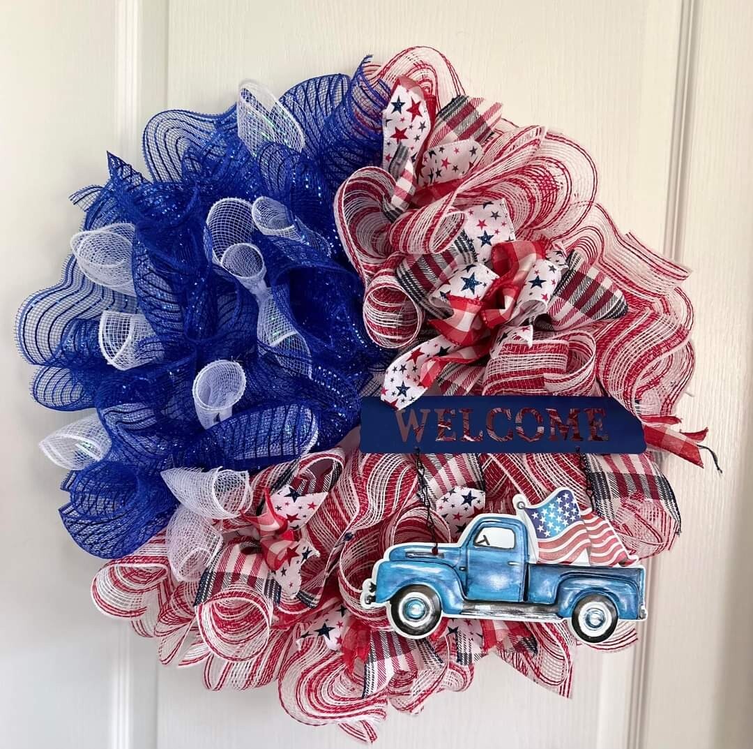 как выглядит New "WELCOME" Patriotic Metal Truck Hanging Sign Farmhouse USA Blue Flag July 4 фото