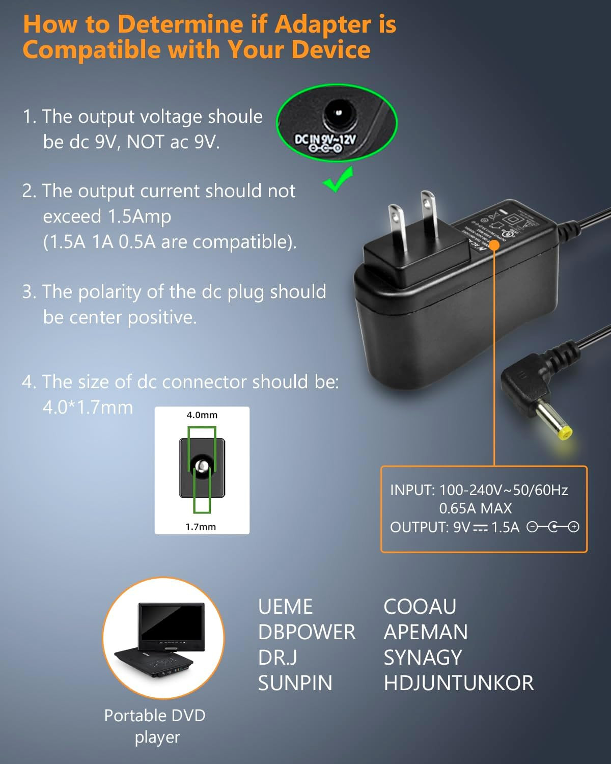 Compatible Devices: Portable DVD Player with 9V DC-IN Port