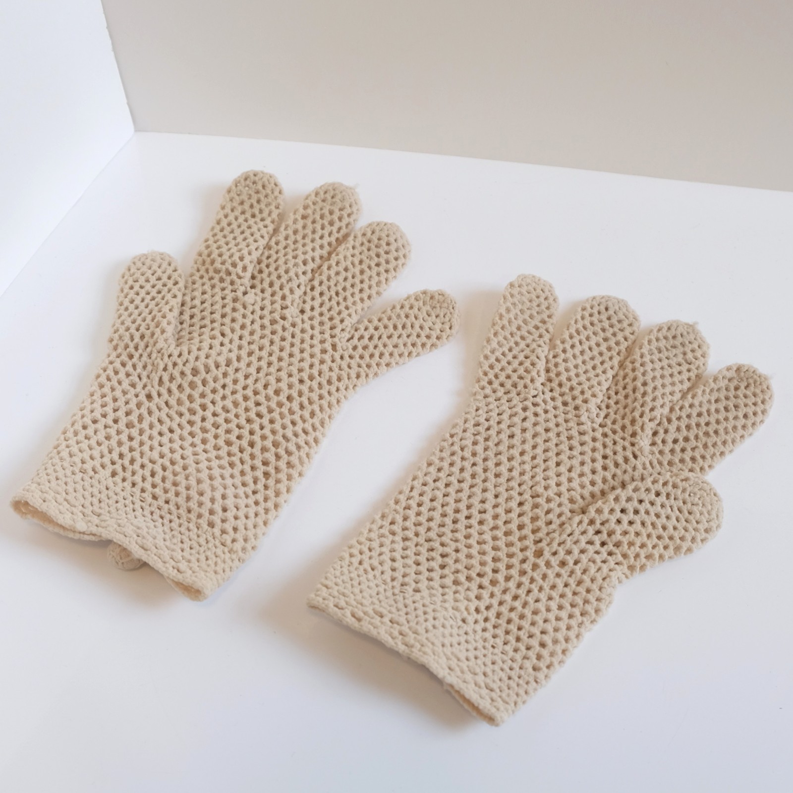 как выглядит Vintage Helanca Crochet Stretchy Gloves 1960s Knotted Off White Made in Italy фото