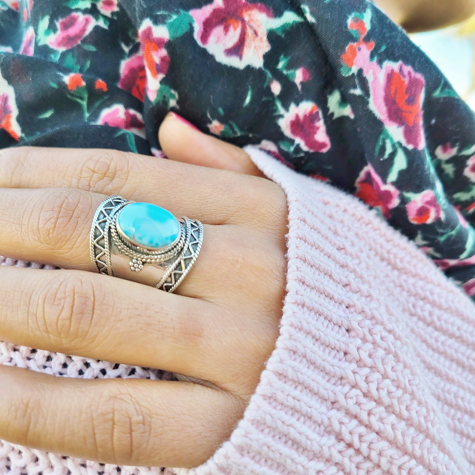 Genuine Larimar Ring 925 Sterling Silver Statement Ring Larimar Pectolite Ring