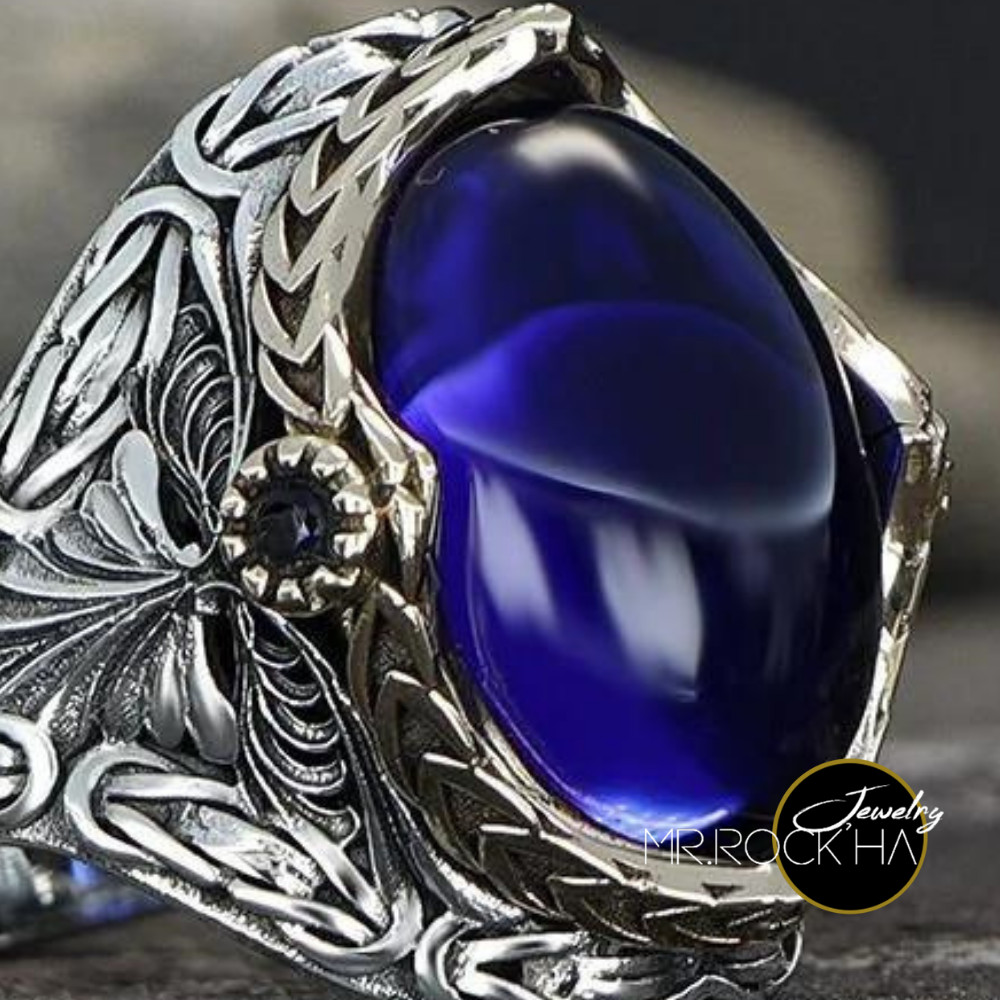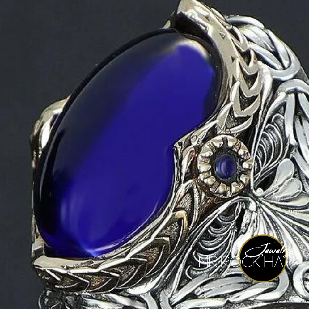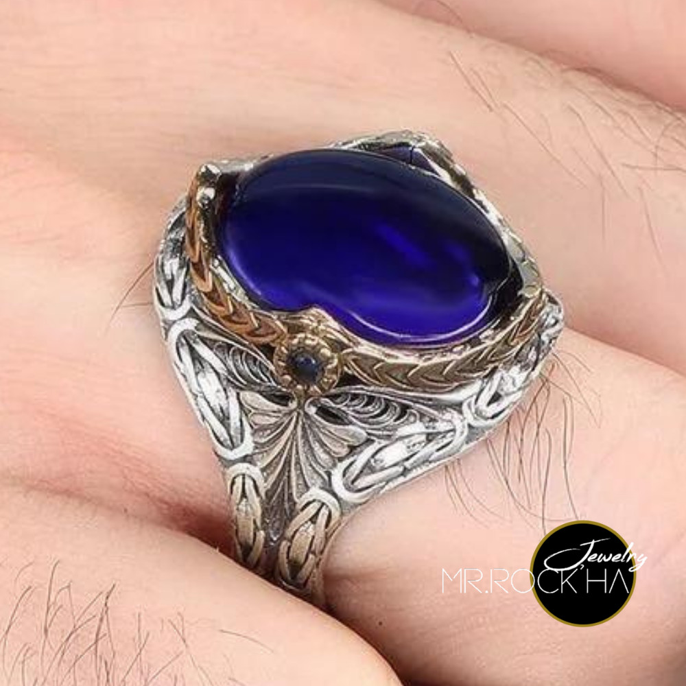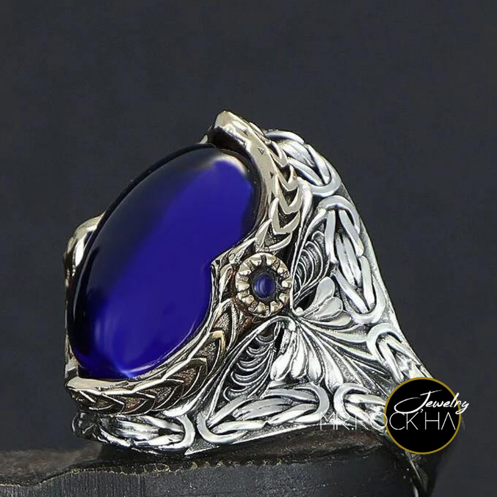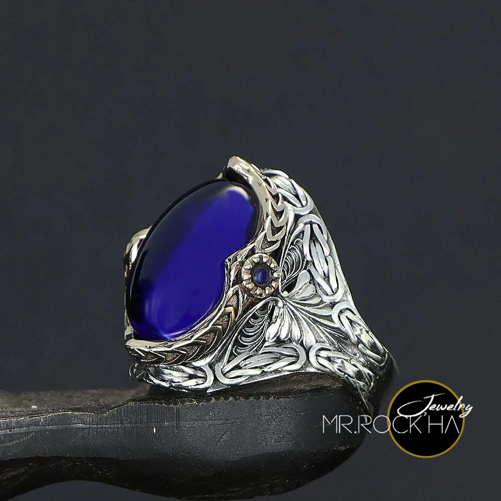 Blue Zircon Stone,King Byzantine Chain Engraving Motif,925 K Silver Men's Ring