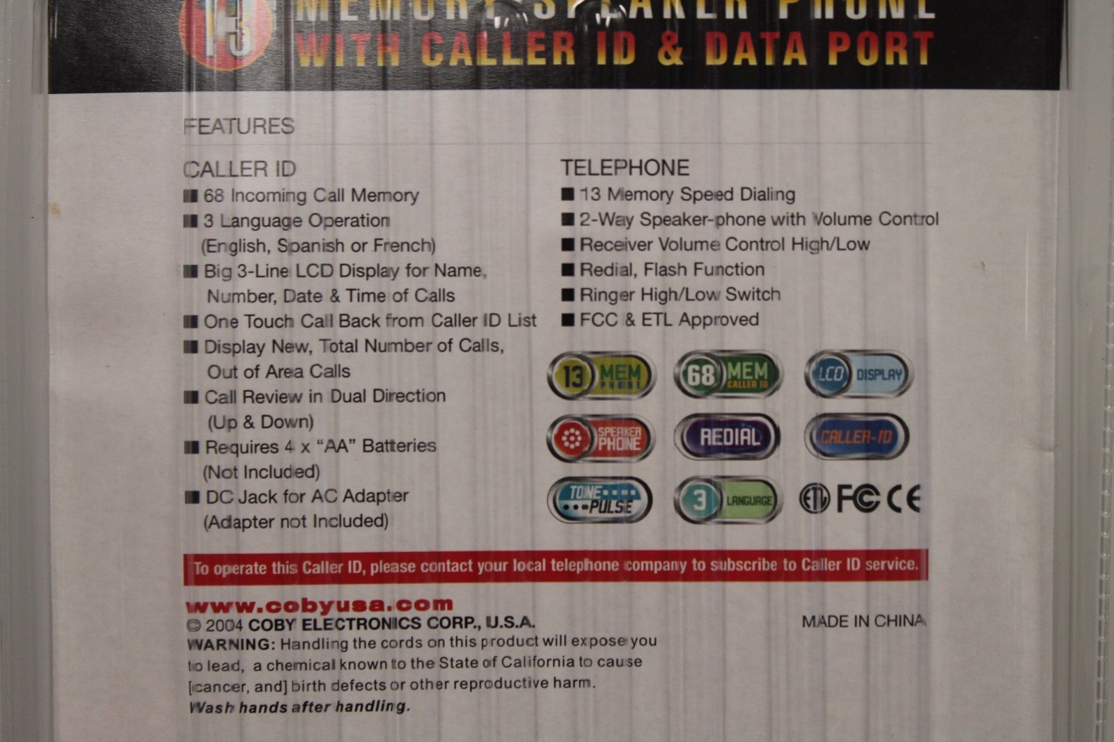 COBY CT-P820 SPEAKERPHONE TELEPHONE CALL WAITING / CALLER ID BIG BUTTON CORDED