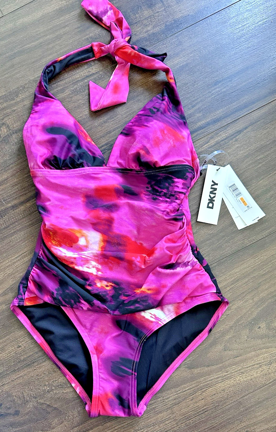как выглядит DKNY Womens Tie-Back Halter-Style one piece swimsuit Pink Multicolor Size XL фото