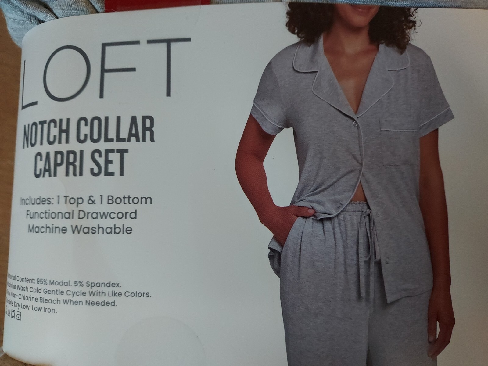 Loft Women Notch Collar Short Sleeve and Drawcord Sleep Capri Pant Set Gray NWT