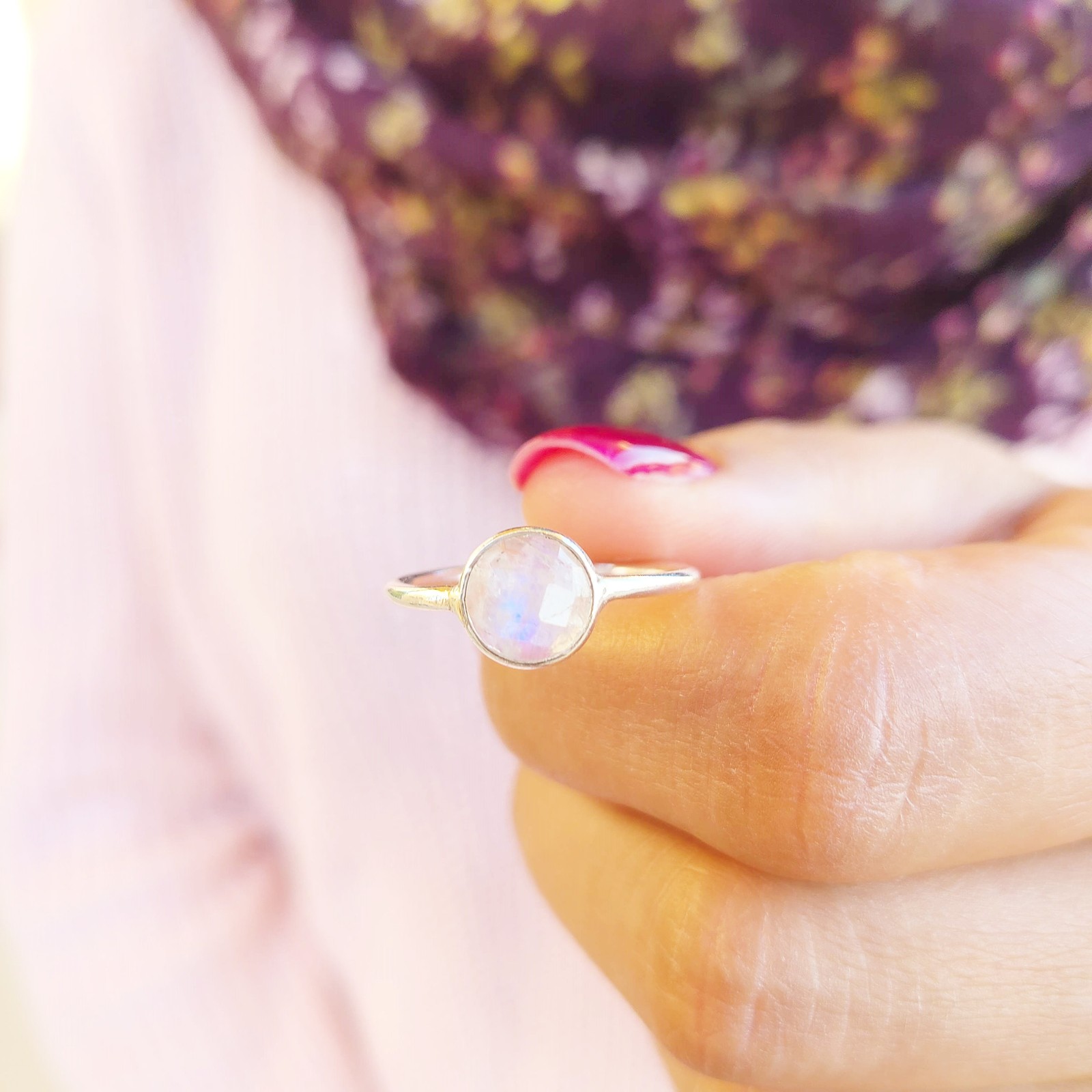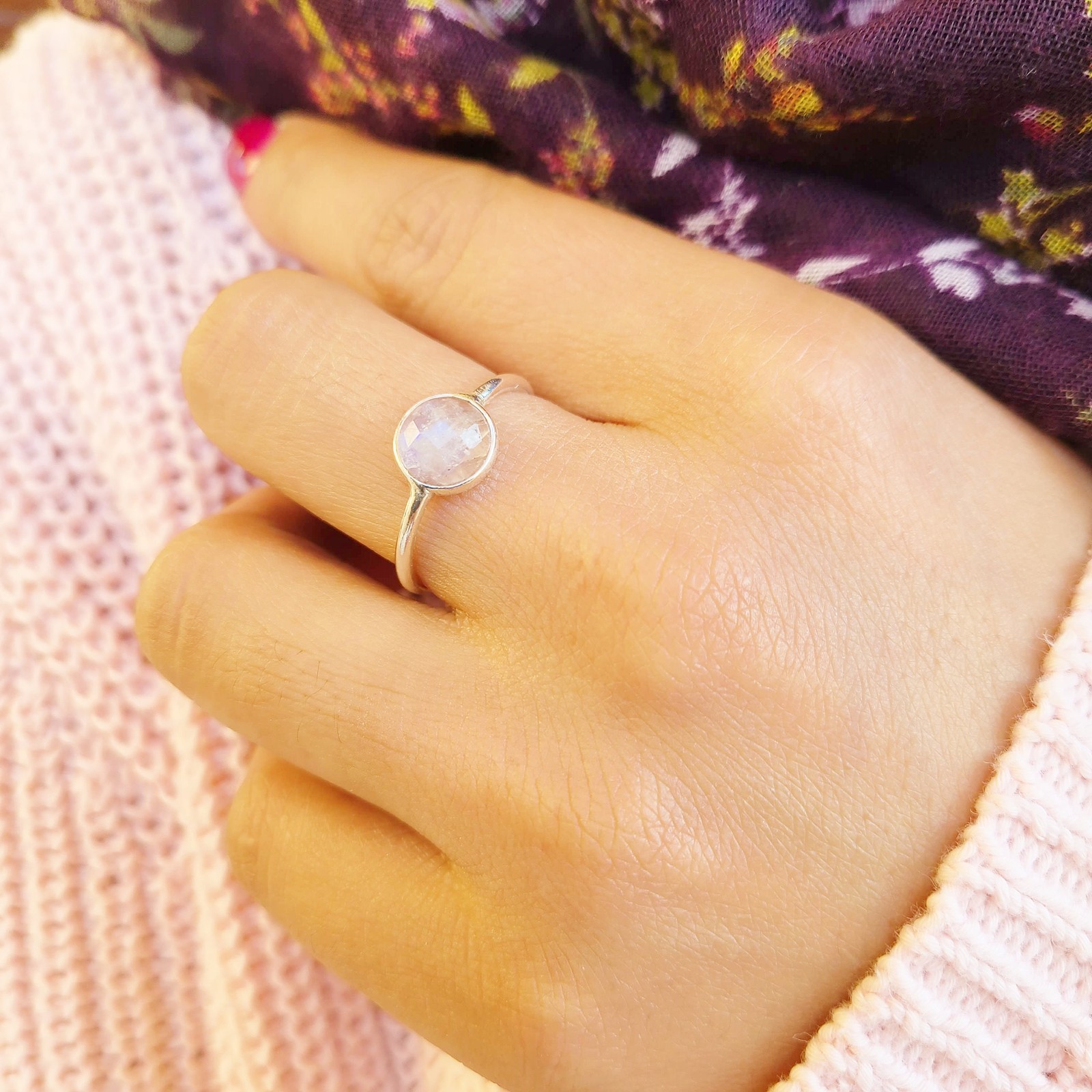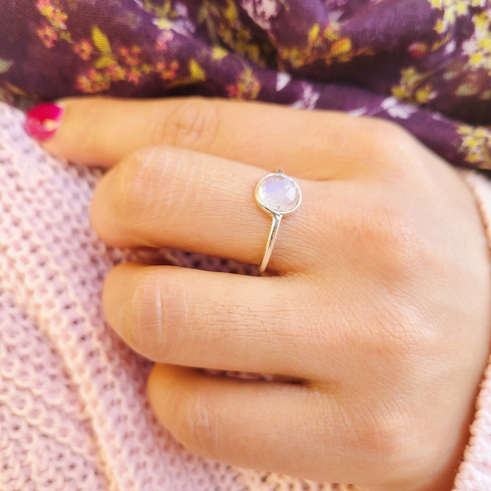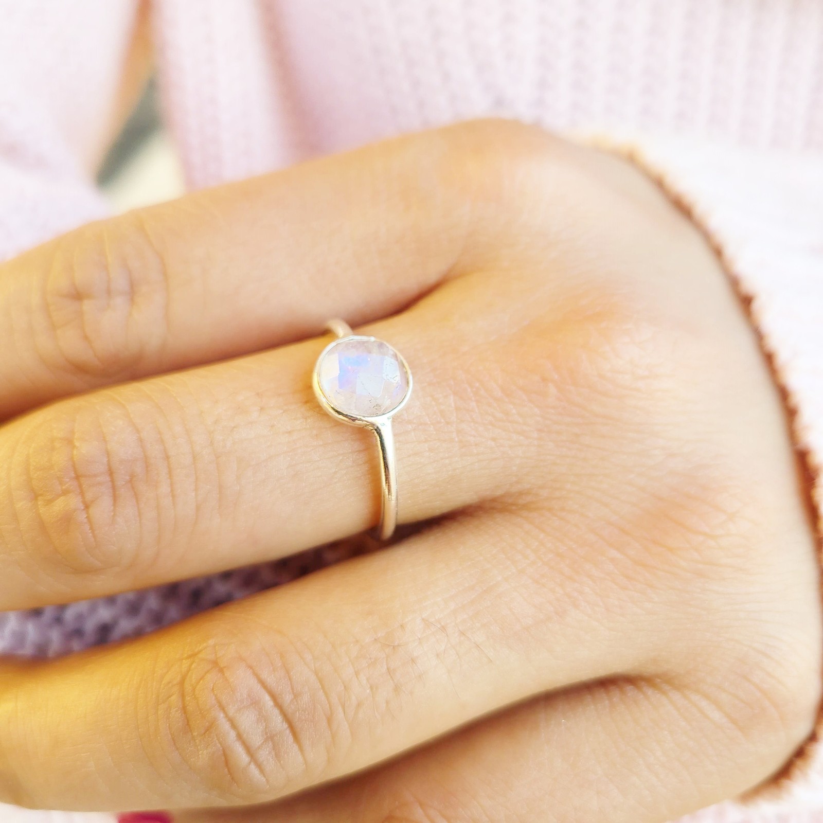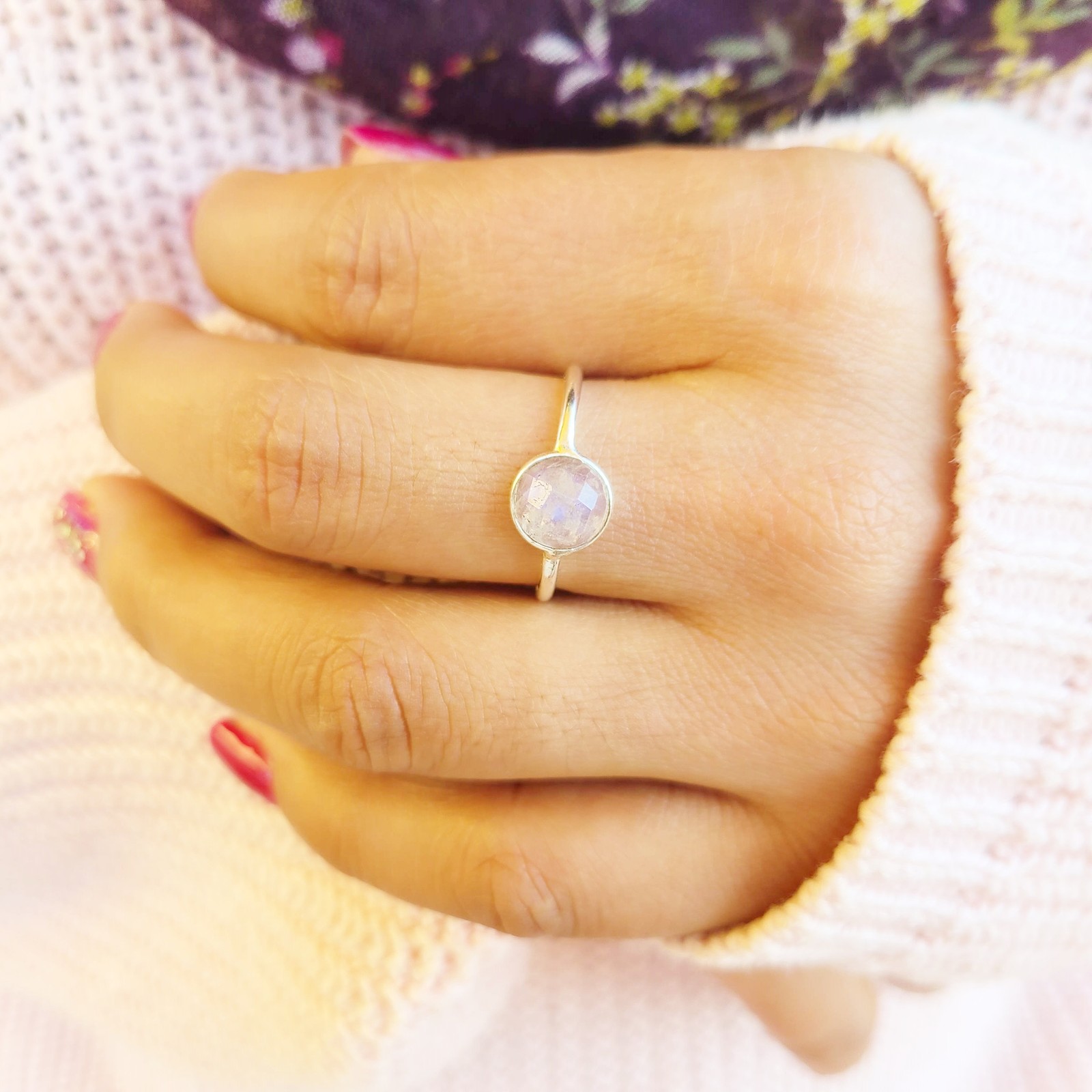 Genuine Moonstone Ring 925 Sterling Silver Dainty Boho Rainbow Moonstone Ring