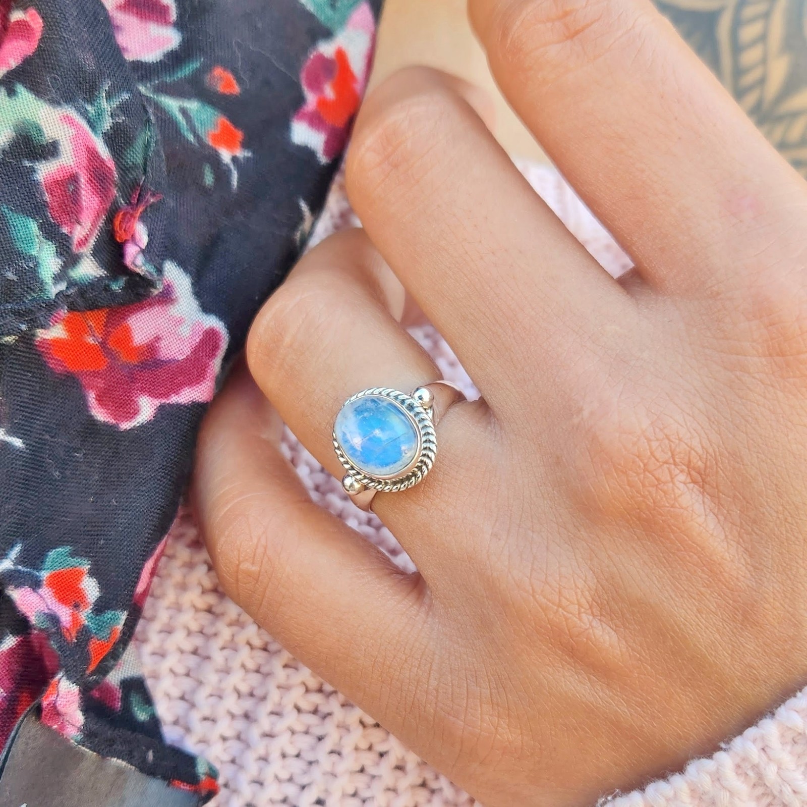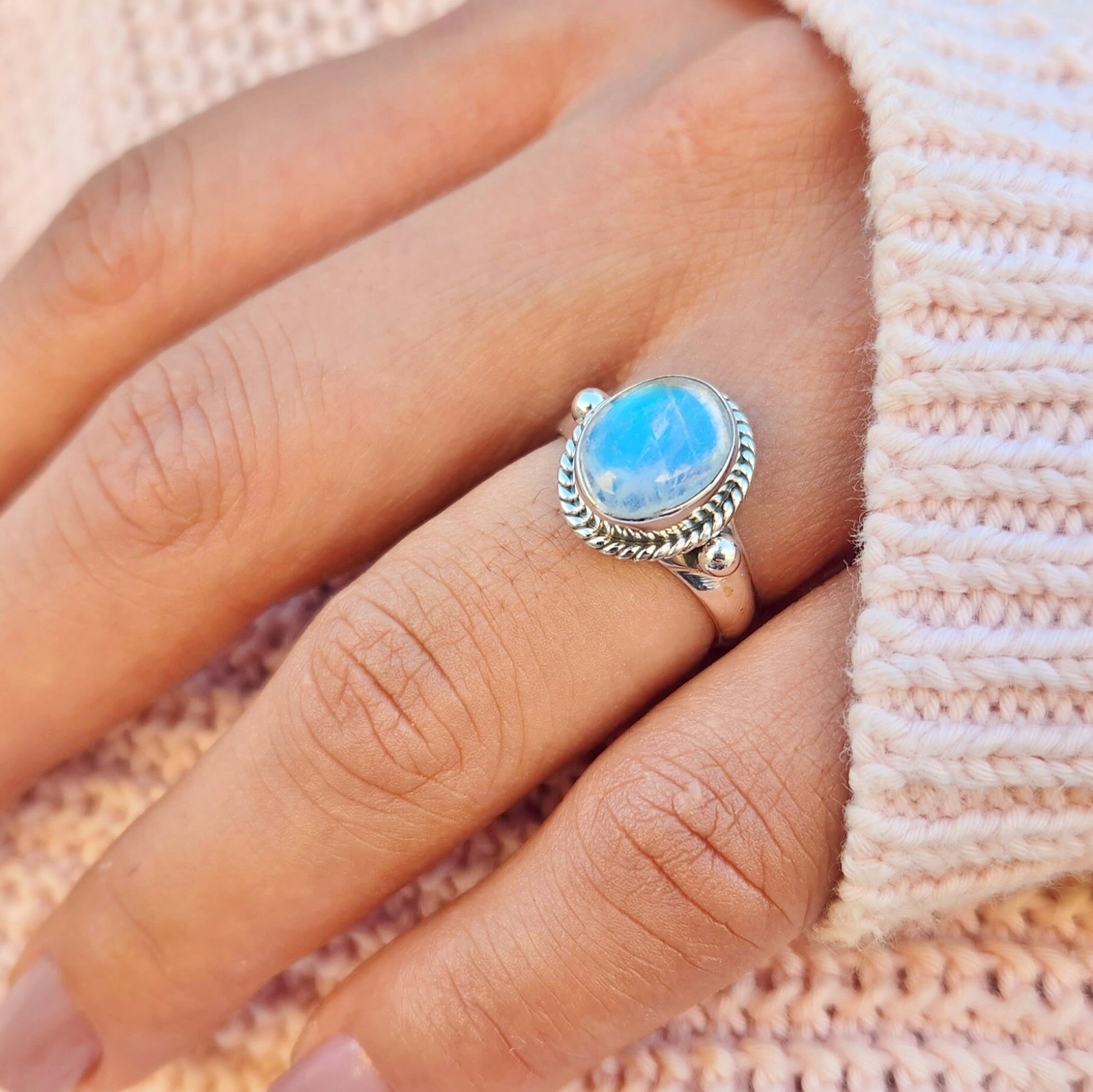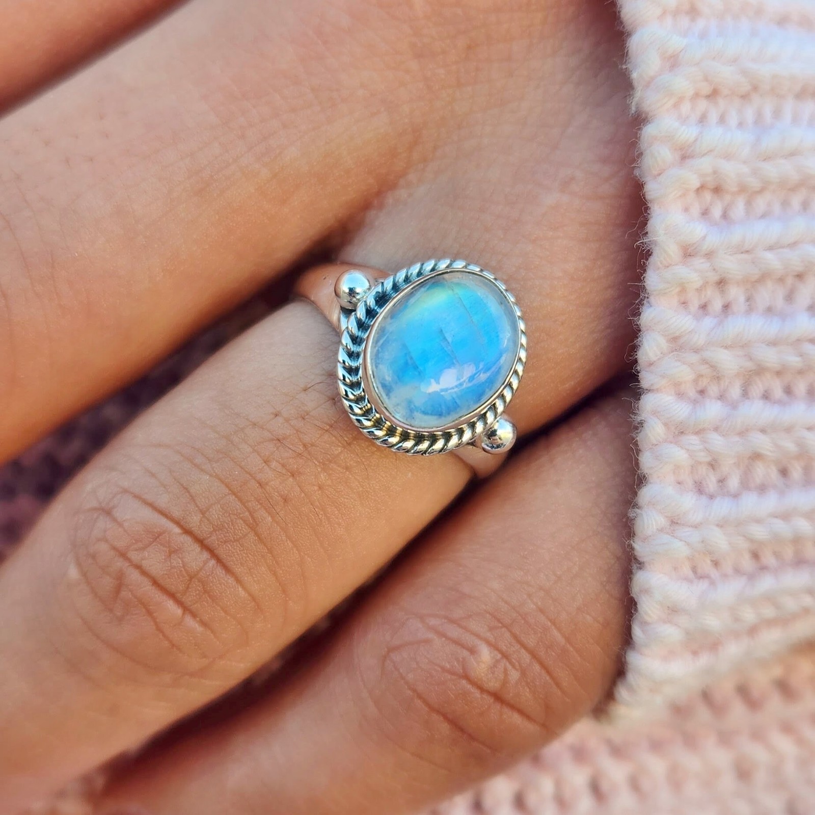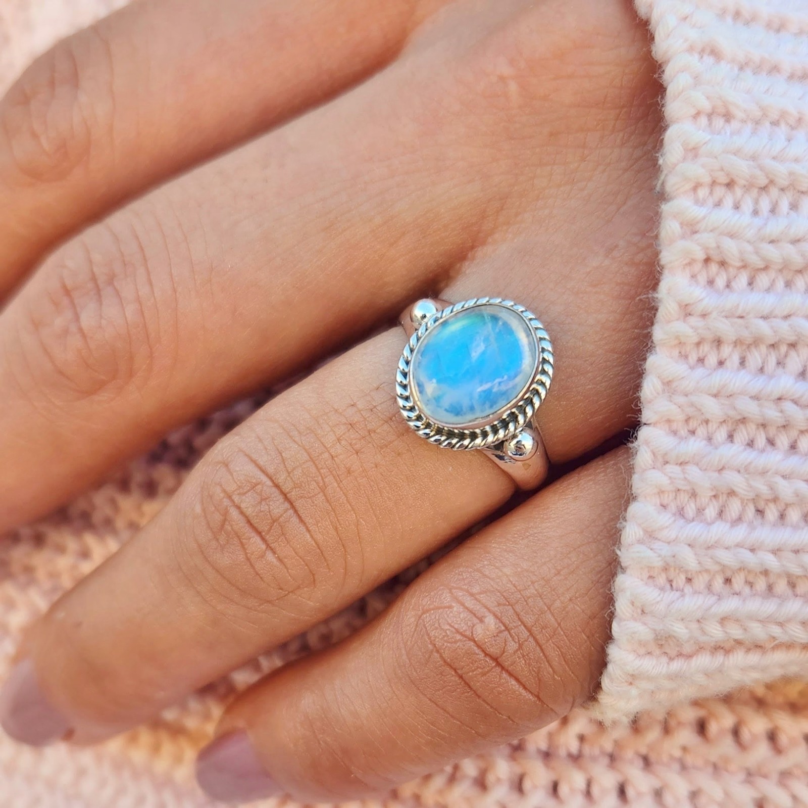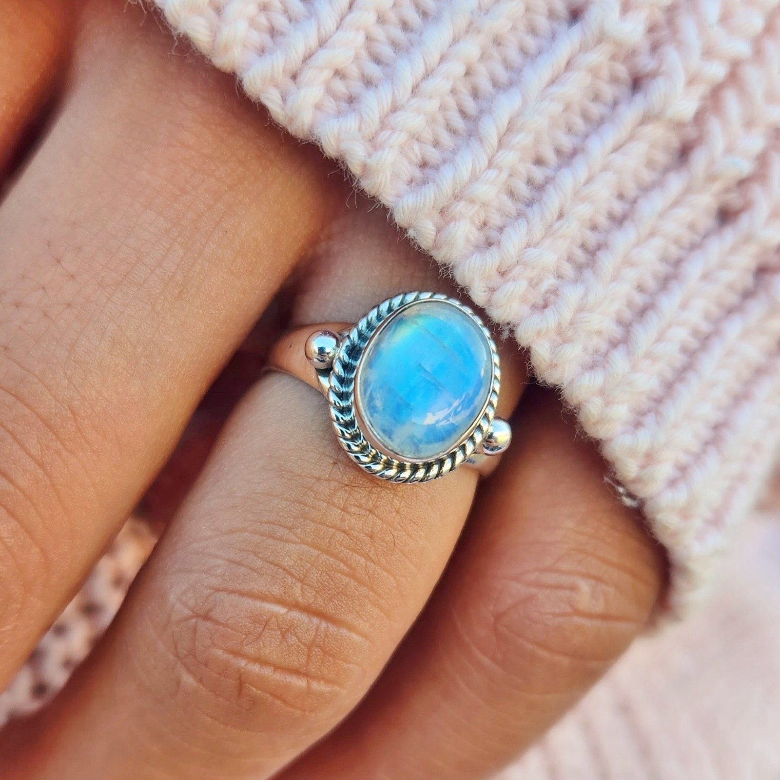 Natural Rainbow Moonstone Ring 925 Sterling Silver Boho Raw Statement Jewelry