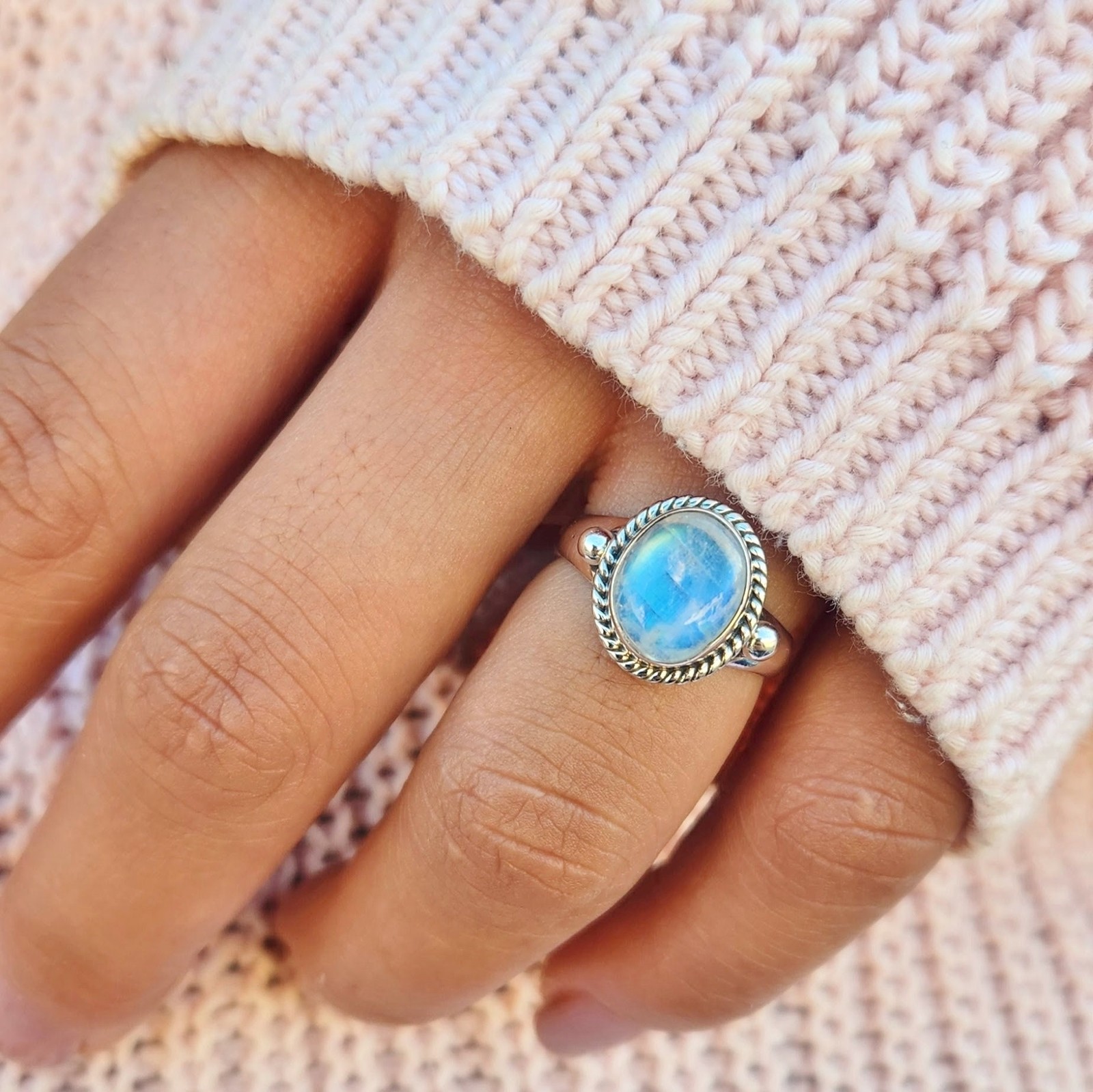 как выглядит Natural Rainbow Moonstone Ring 925 Sterling Silver Boho Raw Statement Jewelry фото