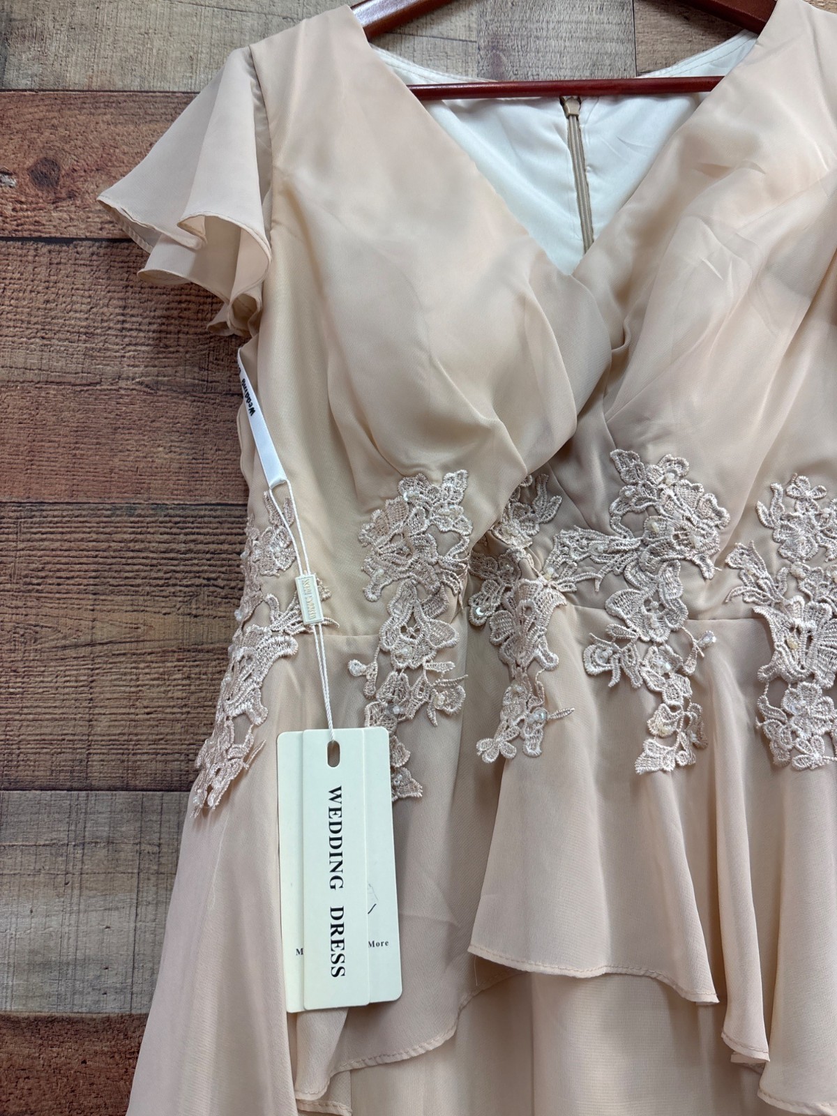 Beige Lace Appliqu Wedding Dress Ruffle Cap Sleeves V-Neck