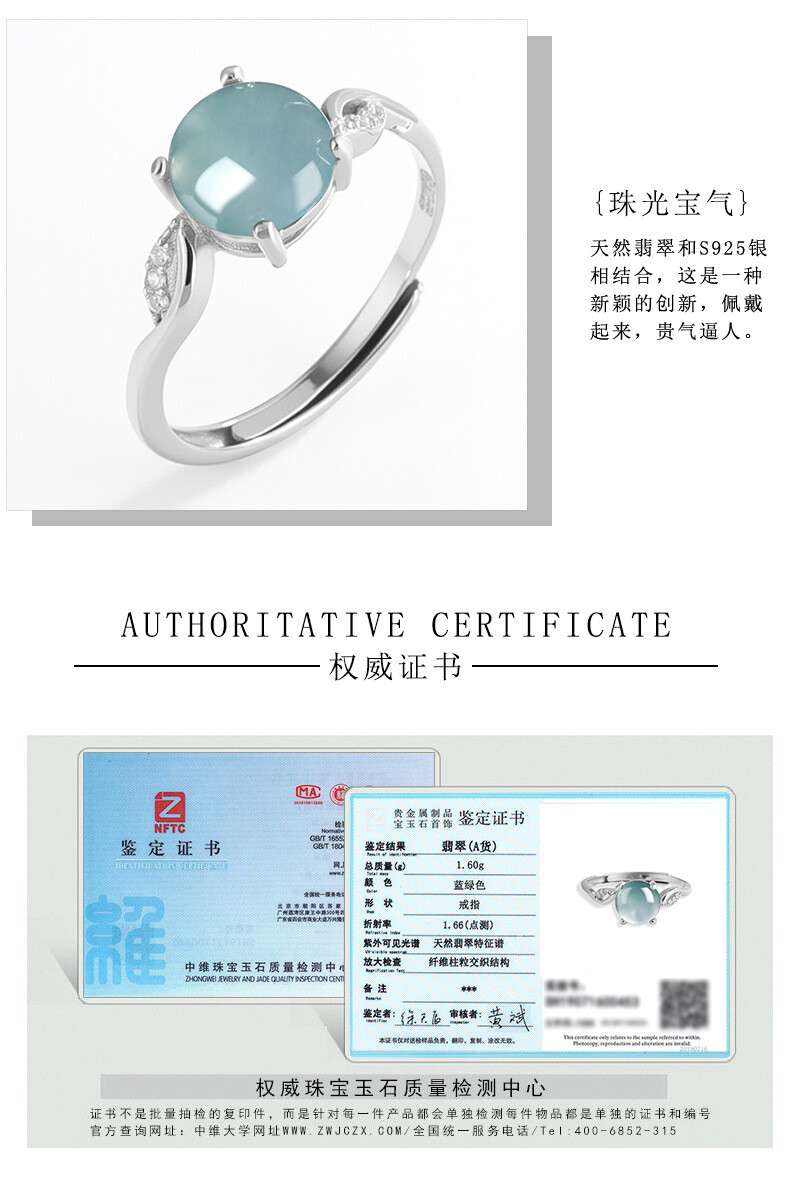 Certified S925 inlaid natural A-grade jade blue water egg face ring adjustable