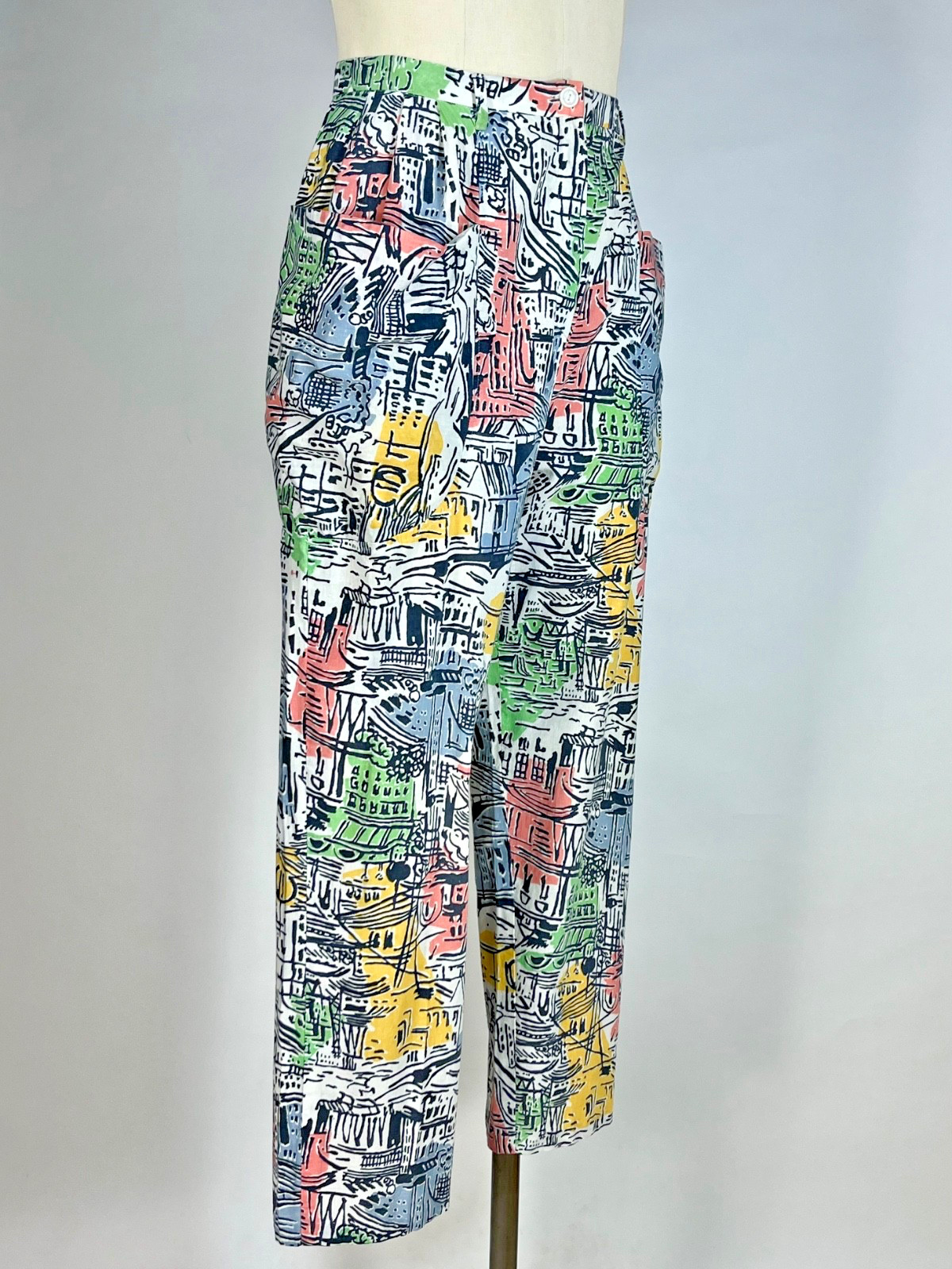 Vintage 1960's city-scene print COTTON capri pedal-pusher clam-digger pants S/M