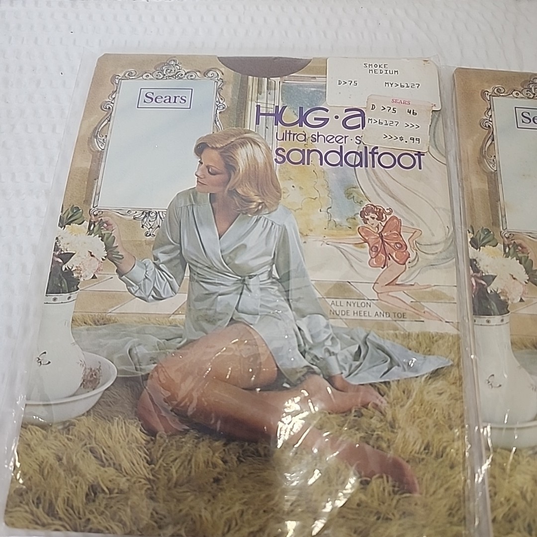 как выглядит Vintage Sears Hug Alon Ultra Sheer Nylon Stocking Sandlefoot Smoke Medium NOS 2 фото