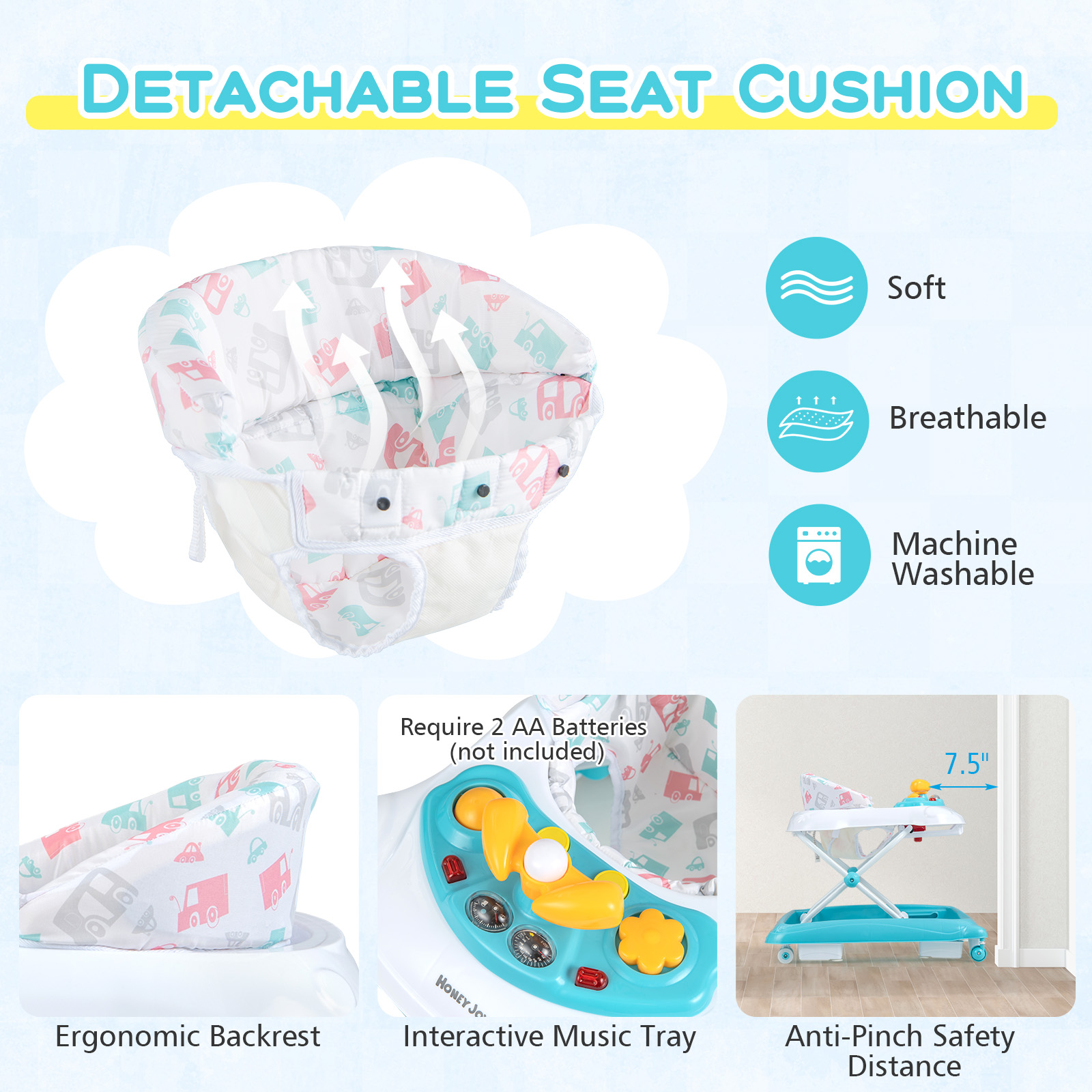 Foldable Baby Walker w/ 3 Adjustable Heights Comfy Padded Seat Music Tray