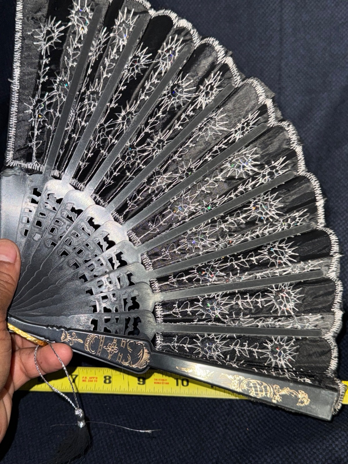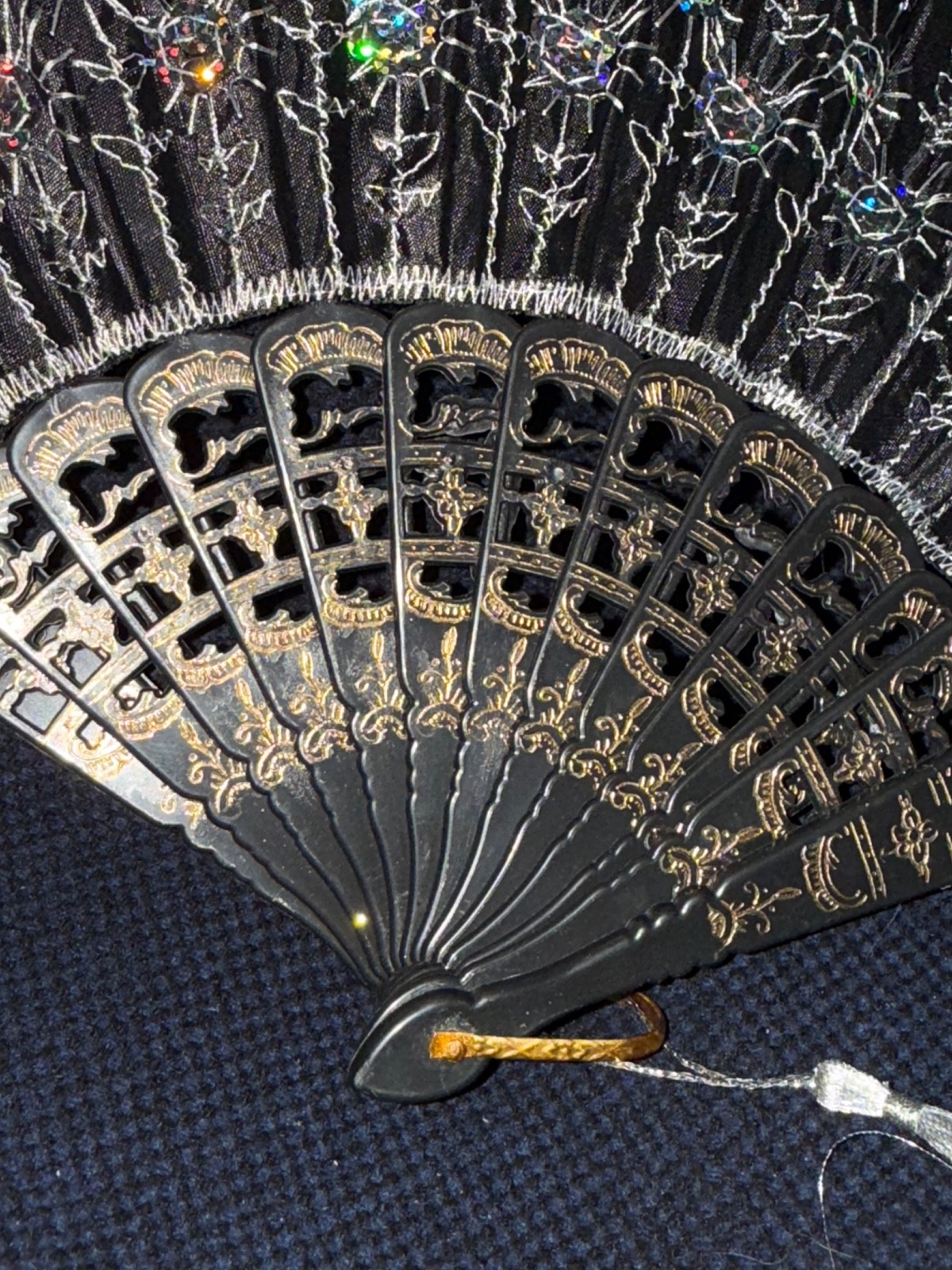 • Peacock Fold Hand Fan Black Fabric Silver Embroidered Sequined Flowers