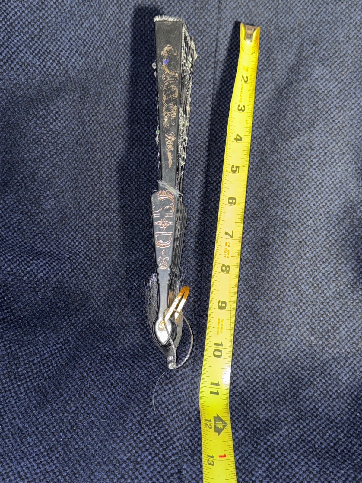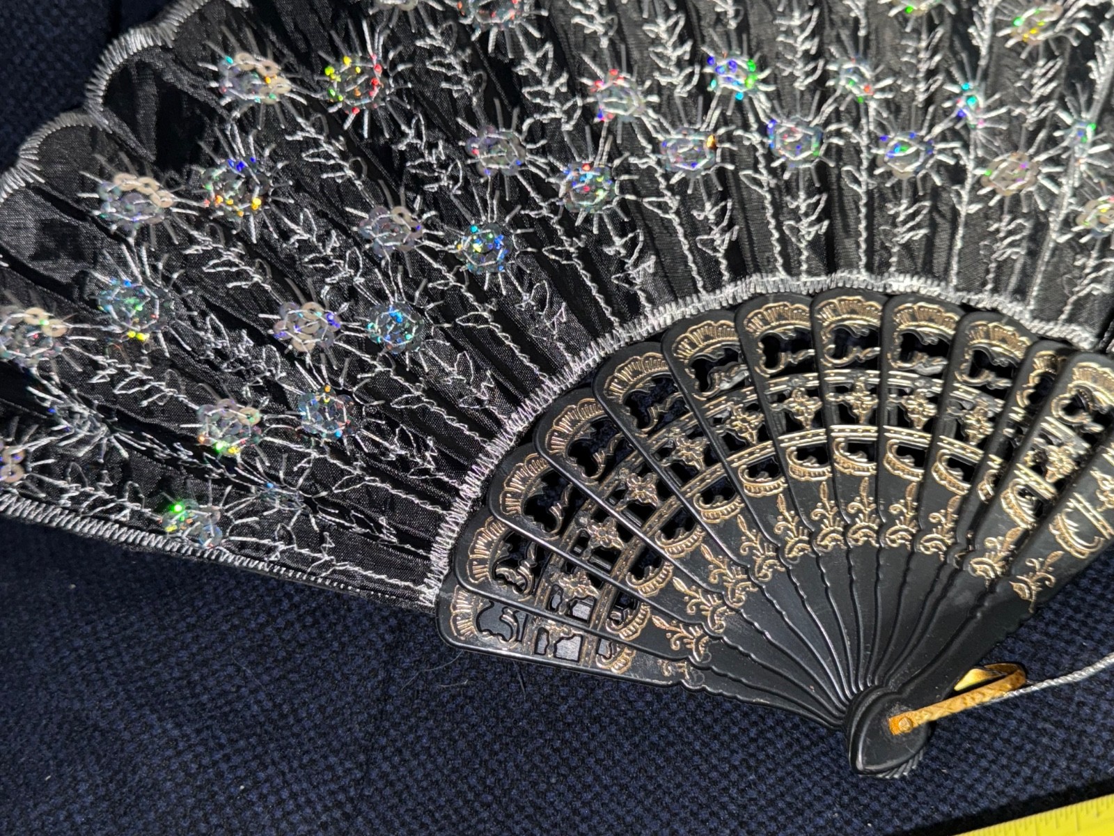 как выглядит Peacock Fold Hand Fan Black Fabric Silver Embroidered Sequined Flowers фото