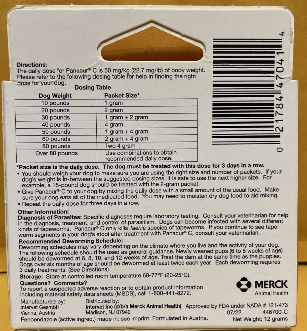 Panacur C 4 gram Canine 40lbs Dewormer Treatment 3 packets exp. Date- 06/2027
