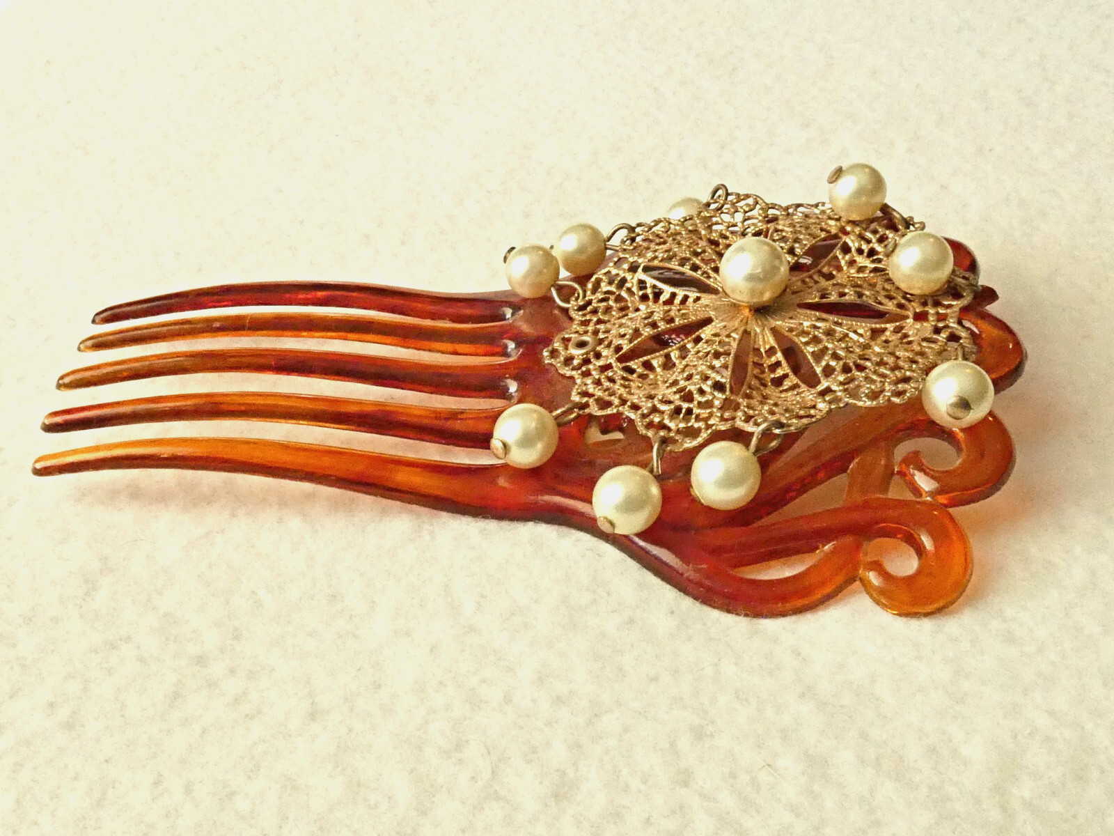 Vintage Large Ornate Hair Comb Gold Filigree Faux Pearls