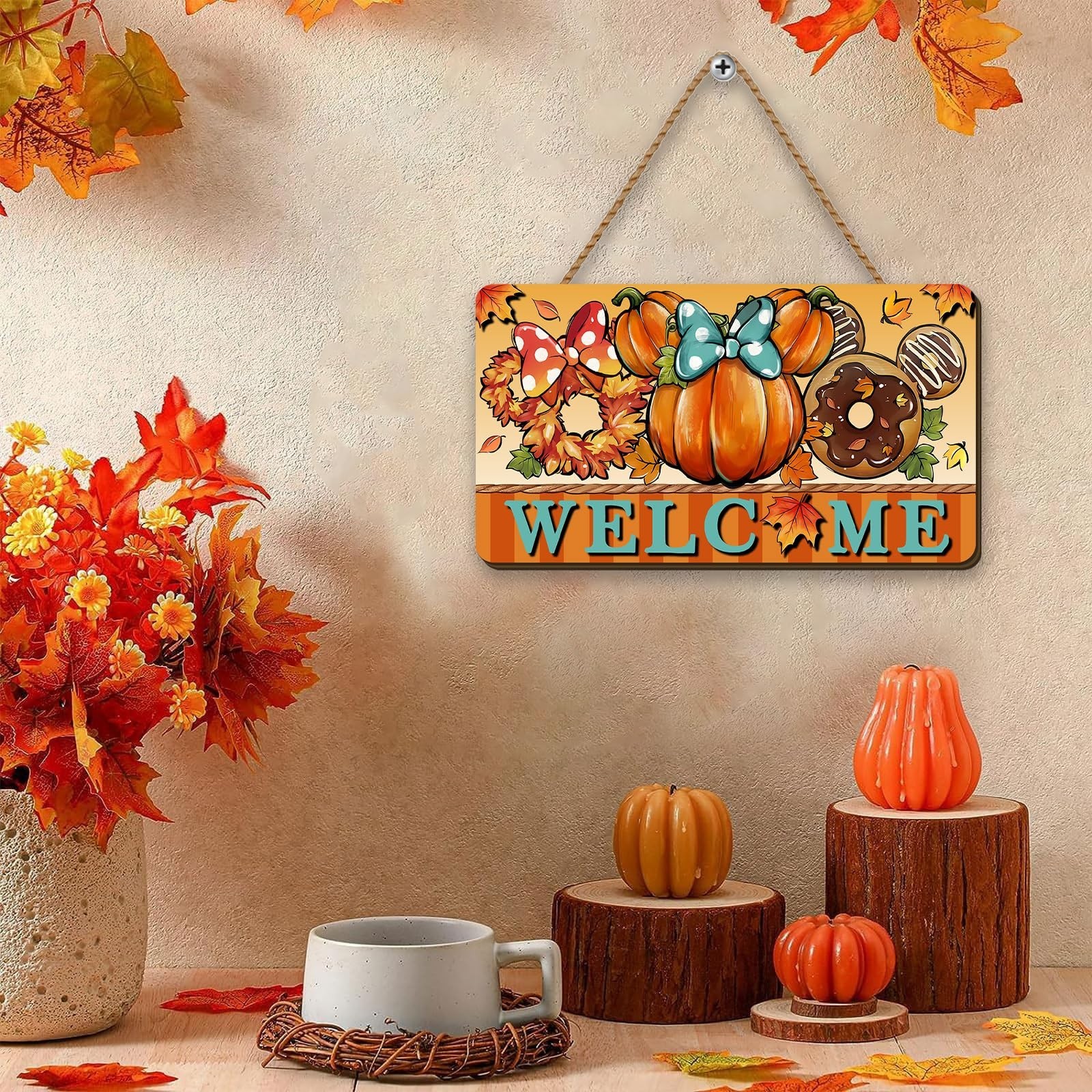 Fall Door Sign Autumn Front Wooden Wreath Hanging Thanksgiving Cartoon Mouse ...